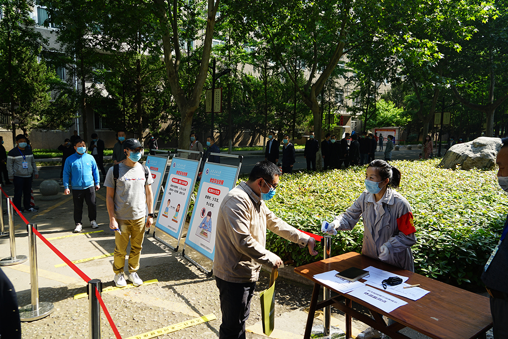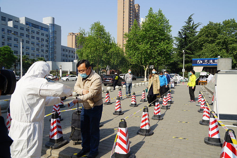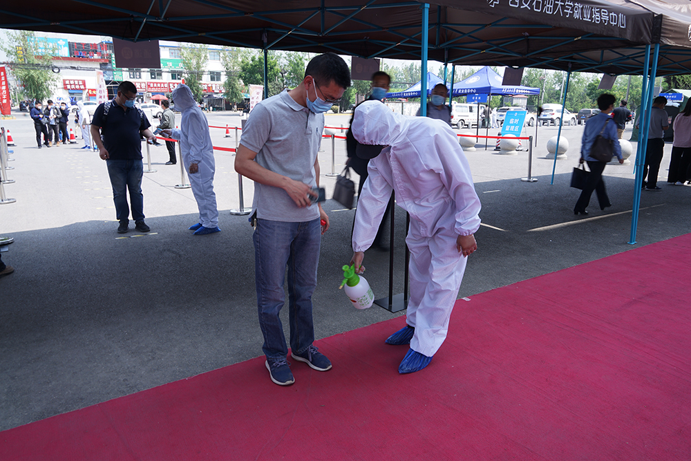 校长李天太下达演练开始命令。在雁塔校区南门和鄠邑校区东门,学生入校时按照地面标线,每人间隔一米,有序排好队伍准备入校,依次进行体温测量、身份核查、健康码查验。入校时一位同学在体温检测时发现异常,在现场工作人员带领下至临时留观区,由校医院医生仔细询问其身体状况,开展体温复测并记录,仍发现该学生体温异常,立即启动应急处置预案,逐级报告疫情防控工作领导小组,安排医生和救护车将体温异常学生送至隔离区。
