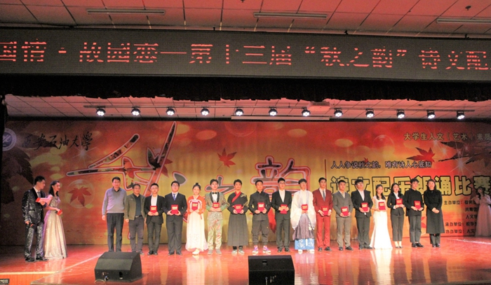 本次比赛的主题是“家国情•故园恋”,经过历时两个月的班级预赛、院系复赛,最终23组选手进入决赛。经过激烈的角逐,最终来自人文学院的《长安之眼》以及石油工程学院的《为国思》荣获一等奖;化学化工学院的《祖国颂》、经济管理学院的《进击的中国》等七个节目荣获二等奖;来自理学院的《七子之歌》、音乐系的《满江红》等十四个节目荣获三等奖。