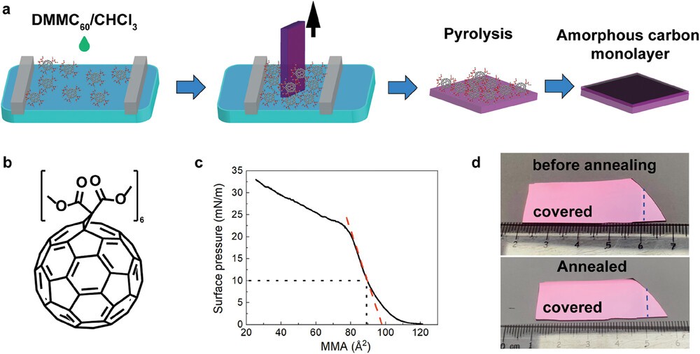 本研究中以改性的富勒烯单体为前驱体,通过Langmuir-Blodgett制膜-快速热解两步法制备了厘米尺寸的单层多孔非晶碳膜。研究证明其为亚稳态结构且不导电。此外,离子跨膜传输研究表明该膜具有阳离子选择性(选择性为26%)。这项工作对单层多孔非晶碳膜的可控制备具有指导意义。