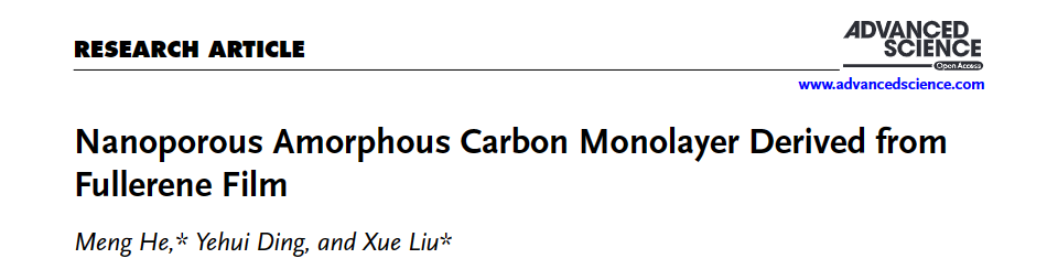 近日,bat365新能源学院新能源材料与器件系青年教师何萌博士为第一作者、bat365中文官方网站为第一完成单位,在国际顶尖期刊《Advanced Science》(中科院一区TOP期刊,2022年IF=15.1,近五年IF=16.7)上发表题为《Nanoporous Amorphous Carbon Monolayer Derived from Fullerene Film》的高水平论文。