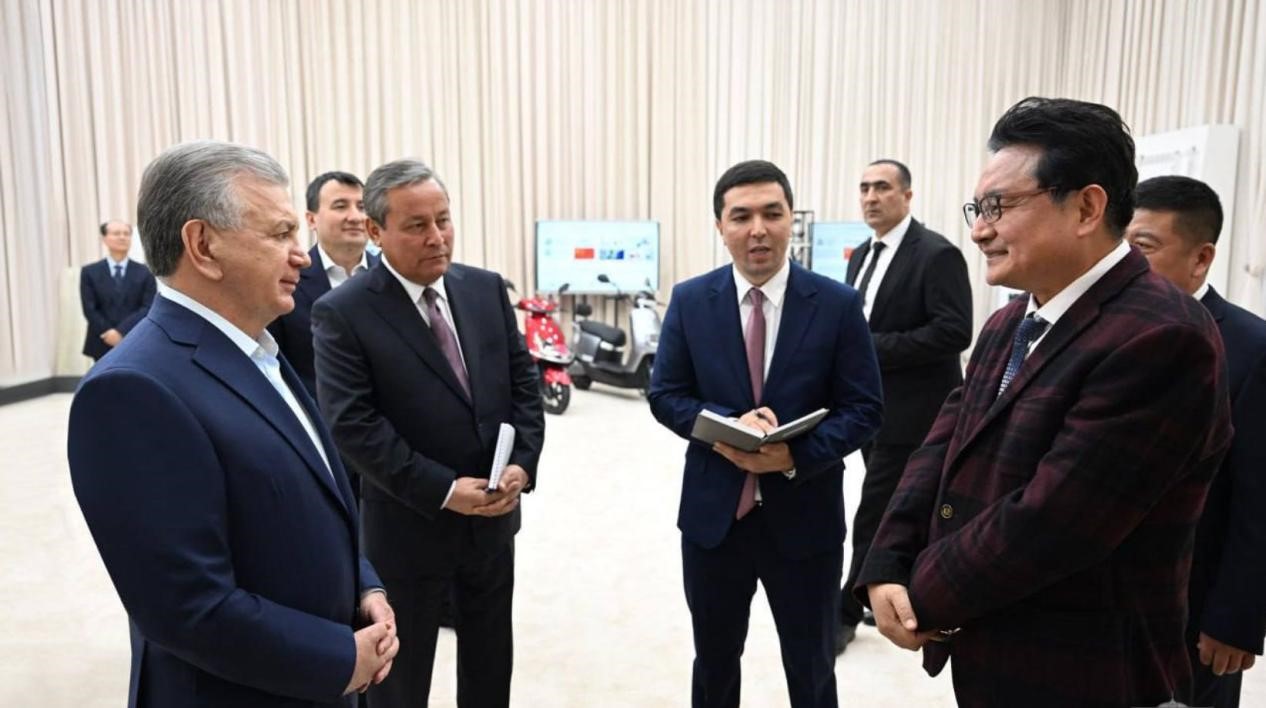 乌兹别克斯坦总统米尔济约耶夫(左一)考察安集延州工业园区并接见赴安集延州商务考察团中方企业代表