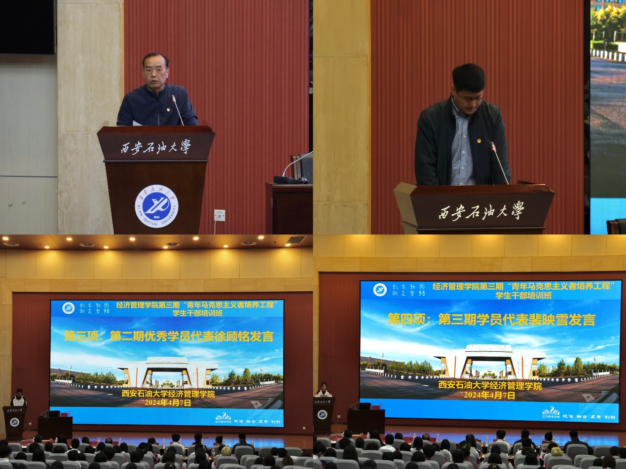 为深入学习贯彻习近平新时代中国特色社会主义思想和党的二十大精神,提高青年学生的马克思主义理论素养和实践能力,引领广大青年做有理想、敢担当、能吃苦、肯奋斗的新时代好青年,4月7日晚,经济管理学院第三期“青年马克思主义者培养工程”学生干部培训班开班仪式暨第一讲在鄠邑校区弘石学术报告厅顺利举办。校党委副书记张木出席开班仪式并作专题辅导报告。经济管理学院党委书记谈建勤,全体学生工作干部以及学生干部400余人参加培训班开班仪式暨第一讲。开班仪式由经济管理学院党委副书记王刚主持。