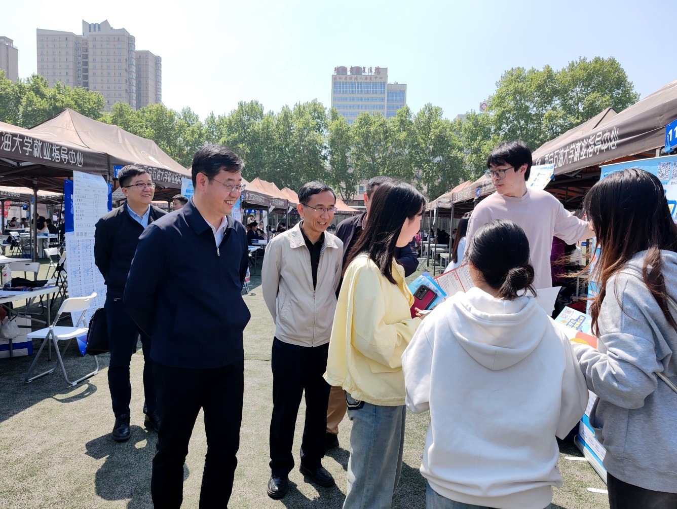 4月12日上午,bat3652024届毕业生春季校园系列第四场综合双选会在雁塔校区田径场成功举办。校长王进富、校党委副书记张木深入招聘会现场调研指导工作。学生工作部(处)(就业指导中心)、教务处相关负责人,各院(系)书记、院长、副书记陪同调研指导。bat365及西北大学、西安建筑科技大学、陕西科技大学、西安工程大学、西安体育学院等兄弟院校3200余名毕业生参加招聘会双选活动。