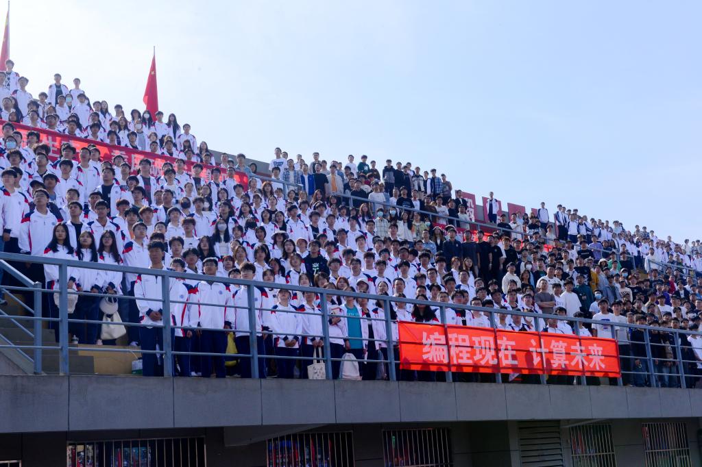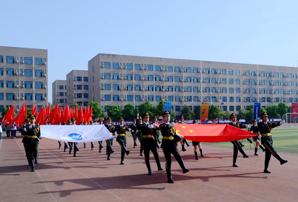 入场仪式完毕,全场起立。在雄壮的国歌声中,大会举行了庄严的升旗仪式,随着五星红旗冉冉升起,全场师生齐唱国歌。