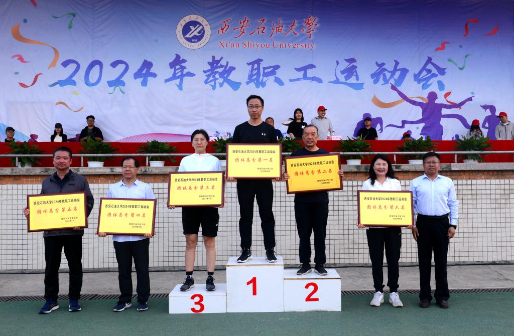 机关七工会代表队、经济管理学院工会代表队、石油工程学院工会代表队、电子工程学院工会代表队、计算机学院工会代表队、人文学院工会代表队分别荣获运动会团体总分前六名,张骁勇为获奖单位颁奖。