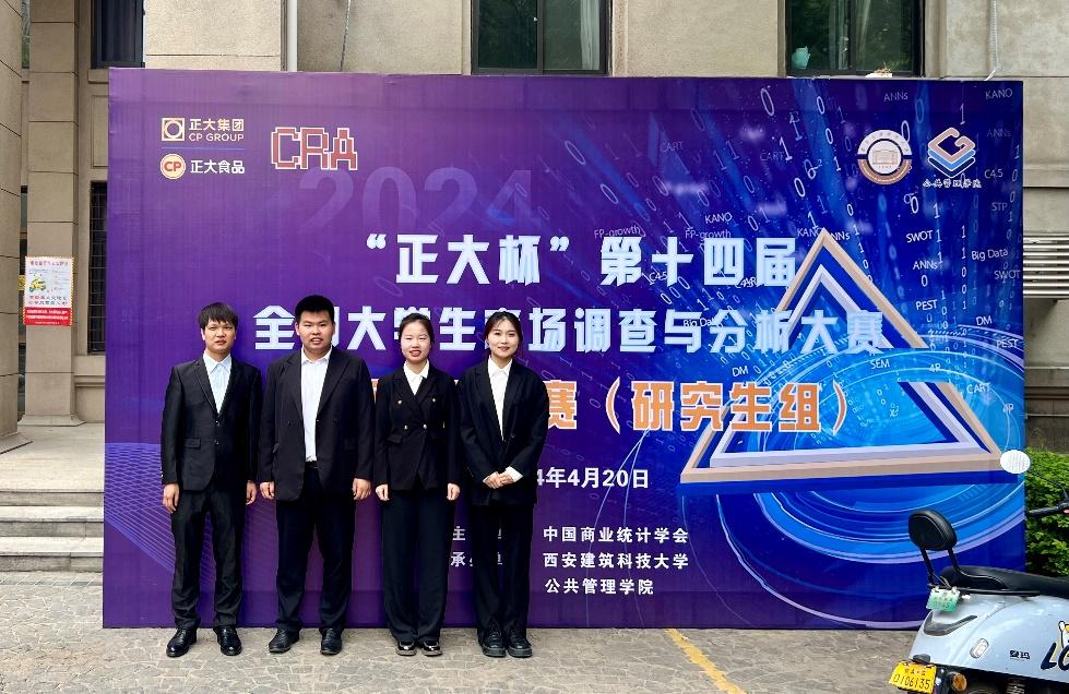 2024年4月,由经济管理学院本科生和研究生组成的12支代表队,在西安财经大学参加了第十四届全国大学生市场调查与分析大赛陕西赛区选拔赛,与省内各高校的552支代表队同台竞技。通过匿名评审和现场答辩等竞赛环节,参赛队伍均获得省级以上奖项,其中:国家级三等奖1项,省级一等奖3项,省级二等奖5项,省级三等奖3项。