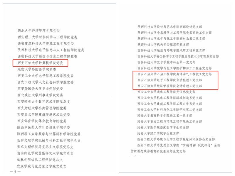 中共陕西省委教育工委下发《关于公布第四批陕西高校党建工作示范高校、标杆院系、样板支部培育创建名单的通知》(陕教工函〔2024〕59号),计算机学院党委入选陕西高校党建工作“标杆院系”,石油工程学院海洋油气工程教工党支部、电子工程学院自动化教工党支部、经济管理学院会计系教工党支部入选陕西高校党建工作“样板支部”。