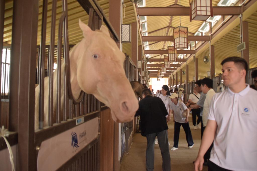 中国的马文化源远流长,《史记》中记载,张骞出西域,归来说:“西域多善马,马汗血。”在马厩中,留学生们见到了自土库曼斯坦引进的阿哈尔捷金马(汗血宝马)。“在古代,汗血宝马就穿越古老的丝绸之路,来到中国,它不仅见证了两国人民的感情,也成为了两国友谊的使者。”来自土库曼斯坦的留学生MERETGYLYJOV BEGENCH(贝玍)这样说到。