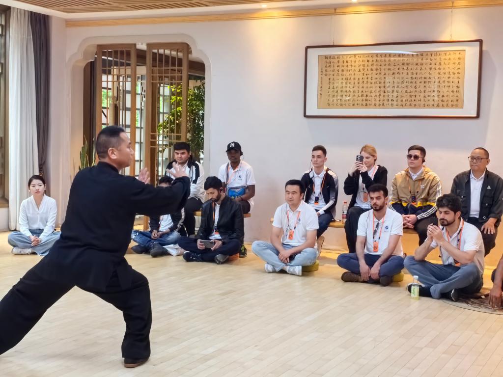 除此之外,同学们还在“师父”的带领下进一步学习了太极武术。“中国太极文化真是太神奇了,太有吸引力了!”来自中非共和国的留学生卡拉在观看太极拳老师拳法时自告奋勇地说,“我要亲自跟师父切磋一下!”