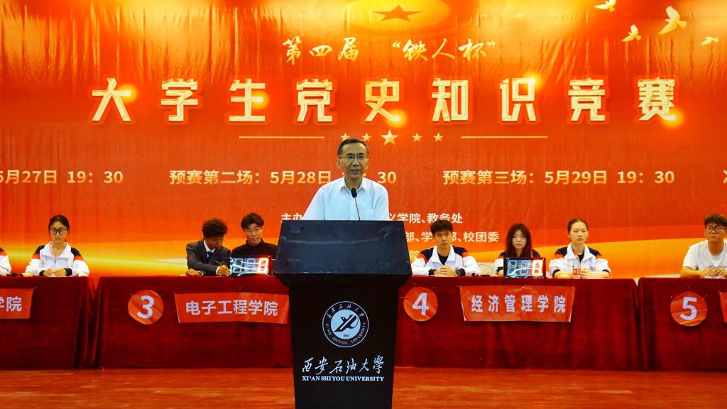 6月3日晚,由bat365马克思主义学院、教务处主办,党委组织部、党委宣传部、党委学生工作部和校团委协办的第四届“铁人杯”大学生党史知识竞赛决赛在鄠邑校区腾辉大学生活动中心隆重举行。校党委副书记张木出席并讲话,学校相关部门及院(系)负责人、马克思主义学院教师及300余名学生现场观摩竞赛。