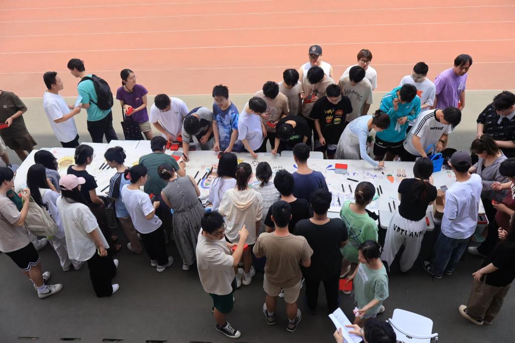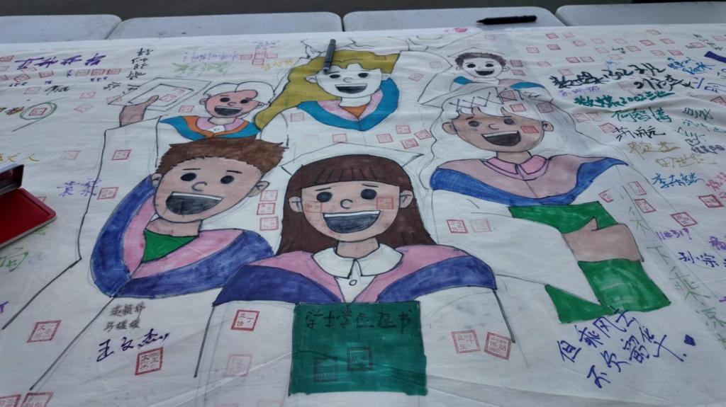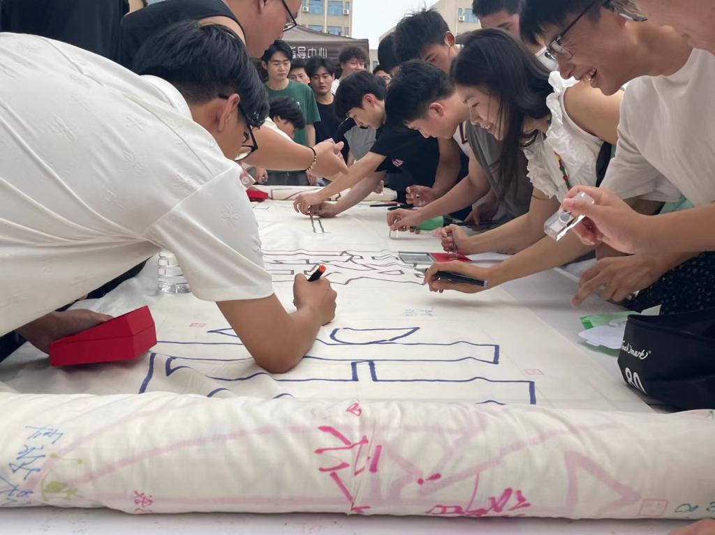 “辉煌明天长卷拓印”主题活动分别在鄠邑校区东区田径场和图书馆南广场展开。在田径场上,长长的画卷两旁围满了熟悉的毕业生身影,大家用自己天马行空的想象,或一人,或三三两两尽情地点墨挥毫、涂抹挥洒,表达离别之意。“山高水长,一路壮歌,看我辉煌明天”,长卷上的这行文字闪耀着同学们大学四年的青春,洋溢着曾经的点点滴滴,此事此刻,仿佛《辉煌明天》歌声响起,大学生活在这一刻重现,未来的日子在这一刻瞬间展望。现场除了毕业生,也有在校生为即将离别的学长学姐送来祝福,大家聚集在一起,用不同的绘画方式进行创作,同学们用歌声,用欢笑,用心语,用自己的方式为未来的自己送上最美好的期许,为即将分别的母校送上最深厚的祝福。经过数日的精心创作与准备,6月14日中午,“辉煌明天长卷拓印”主题活动终于在鄠邑校区图书馆南广场迎来了其收官之作,当一条长达50余米的长卷铺展开来,宛如一条历史的长河,见证着学校的发展历程和毕业生们的成长足迹。活动现场吸引了近千名师生踊跃参与、驻足观赏,现场师生用自己的画笔和色彩,在长卷上描绘出一幅幅充满创意和希望的画面,绘制现场热闹非凡,大家沉浸其中,充分施展才华,为长卷画龙点睛、锦上添花,共同展开创作这幅波澜壮阔的巨幅画卷。长卷中各具特色的创作形式,出自师生们的奇思妙想和独特创意,表达了毕业生对母校的不舍与感激,体现了老师们对学子最真挚的祝福与鼓励。当这条承载着毕业生们情感和回忆的长卷完成时,现场响起了热烈的掌声和欢呼声,毕业生们纷纷上前合影留念,将这份难忘的记忆永远定格在了这一刻。