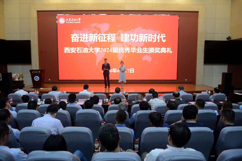 校党委书记常江在讲话中向受到表彰的优秀毕业生表示祝贺,向全体2024届毕业生致以最诚挚的祝福。他指出,本次颁奖典礼是在全校学生中营造崇尚优秀、学习优秀、争当优秀“比学赶帮超”浓厚氛围的重要举措,也是展示学校毕业生时代风采,激励广大同学建功立业、奉献青春的重要途径。他希望,全体2024届毕业生,要有永葆热爱、怀揣梦想的激情,要有行而不辍、履践致远的毅力,要有继往开来、乘风破浪的勇气,用“好学力行”的品德来修身,用“自强不息”的精神去奋斗,并向全校学生寄语:一是让学习成为一种习惯。希望同学们树立终身学习的理念,不断丰富知识,全方面提升自我,努力学习科学文化知识,积极投身实践锻炼,注重独立思考,做到学思结合,知行统一,以实际行动诠释“好学力行、自强不息”的校训精神;二是让卓越成为一种追求。希望同学们赓续红色血脉,传承铁人精神,不断挑战自我,实现自我超越,创造更大辉煌,在追求卓越的道路上,不仅要有海纳百川的胸怀,更要以勤奋和踏实的态度面对每一个挑战,创造属于自己的精彩人生;三是让感恩成为一种品质。希望同学们常怀感恩之心,感谢父母的养育之恩、老师的教诲之情、同学的帮助之谊,也要敬畏自然、敬畏生命,珍惜我们所拥有的一切,鼓励大家在逆境时学会善待自己,给自己信心和勇气,在顺境时更要善待他人,以谦逊和善良的心去帮助更多的人,以乐观积极的心态影响身边的人和事;四是让坚持成为一种能力。希望同学们能深刻理解坚持的重要性,并作为优秀的品质贯穿自己的人生,在人生的旅途中,要牢记“人在事中磨”,塑造坚韧不拔的意志和勇往直前的精神,希望同学们直面“内卷”,远离“佛系”,拒绝“躺平”,决不“划水”,保持对目标的执着追求,克服困难,实现梦想。