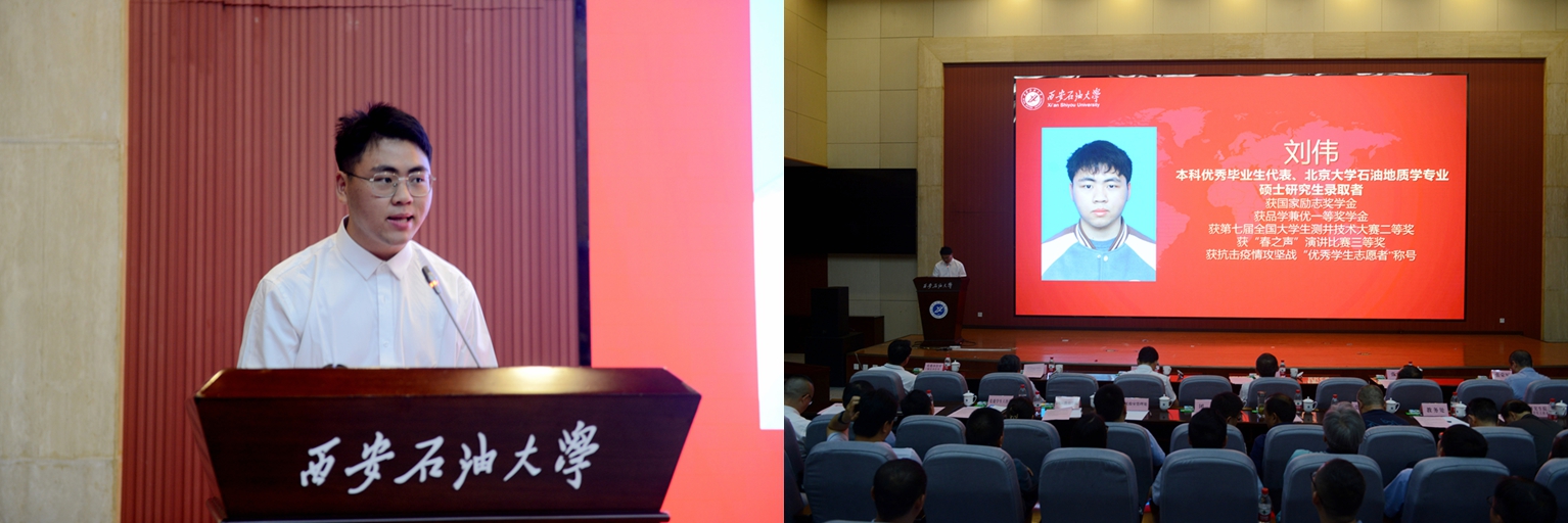 中共党员、陕西省大学生自强之星、陕西好青年荣誉称号获得者,石油工程学院学生梁欢;本科优秀毕业生代表、北京大学石油地质学专业硕士研究生录取者,地球科学与工程学院学生刘伟;国际学生本科优秀毕业生代表、哈萨克斯坦籍留学生,国际教育学院学生亚历山大;中共党员、硕士研究生优秀毕业生代表、西安交通大学管理科学与工程专业博士研究生录取者,经济管理学院学生董艺佳;中共党员、卫国戍边退役毕业生代表、西部基层就业优秀毕业生代表,石油工程学院学生刘国栋分别作了交流发言。