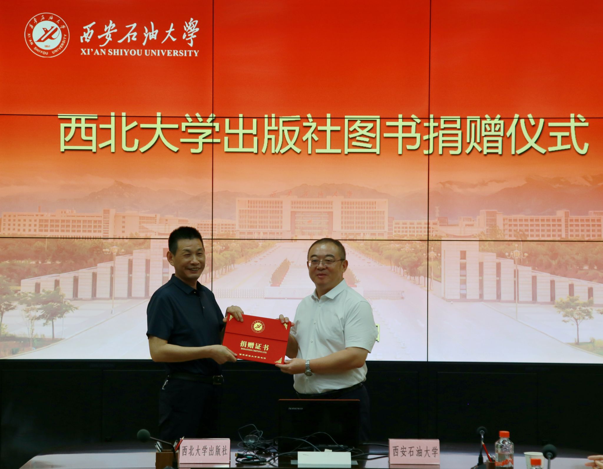 常江向桂方海颁发收藏证书,并代表学校对西北大学出版社支持学校文献资源建设和校园文化建设工作表示衷心的感谢。常江指出,西北大学出版社作为一家综合性出版机构,出版优势突出、特色鲜明,具有较高的影响力和知名度,双方今后可在多方面进一步加强合作。