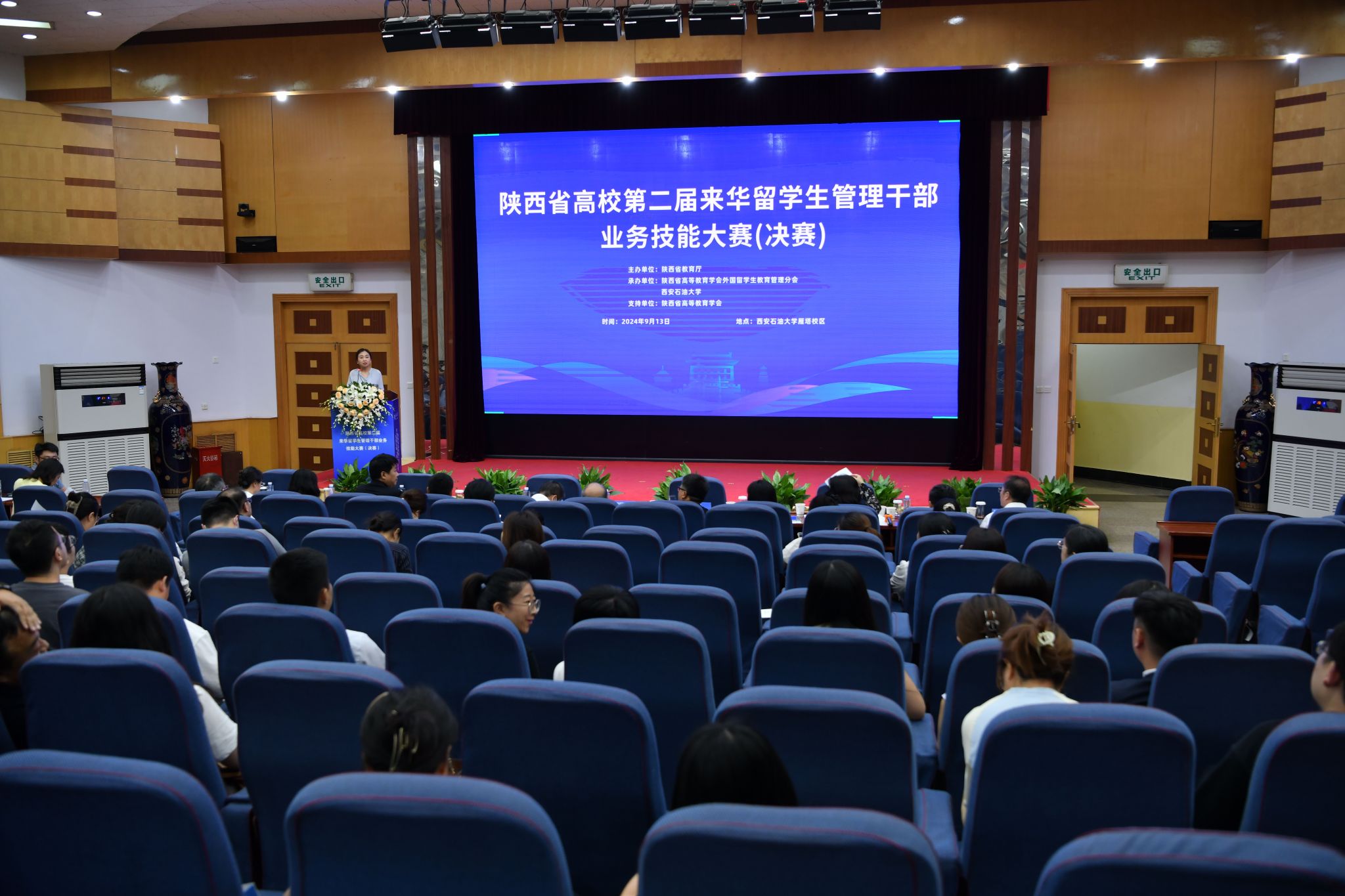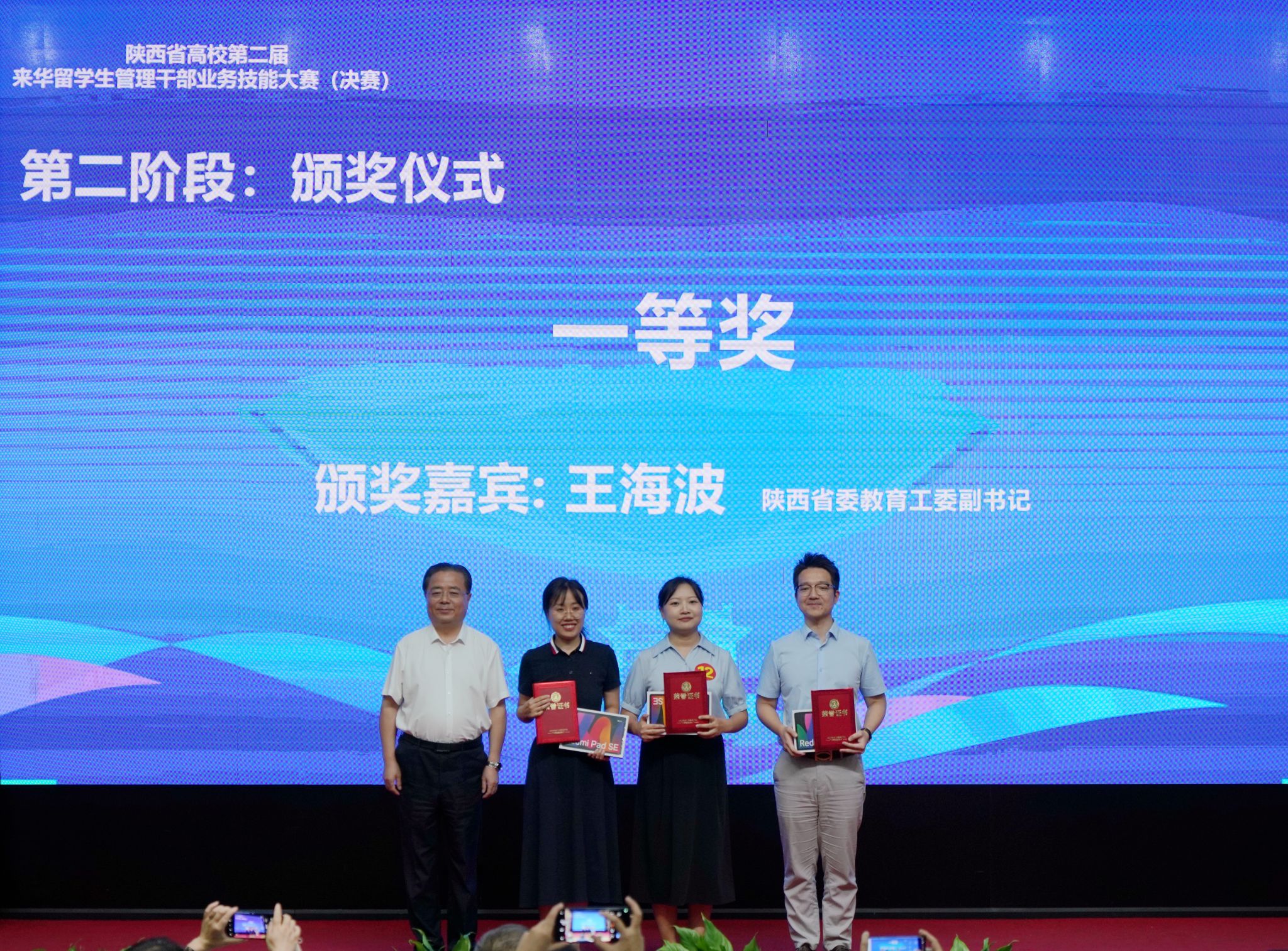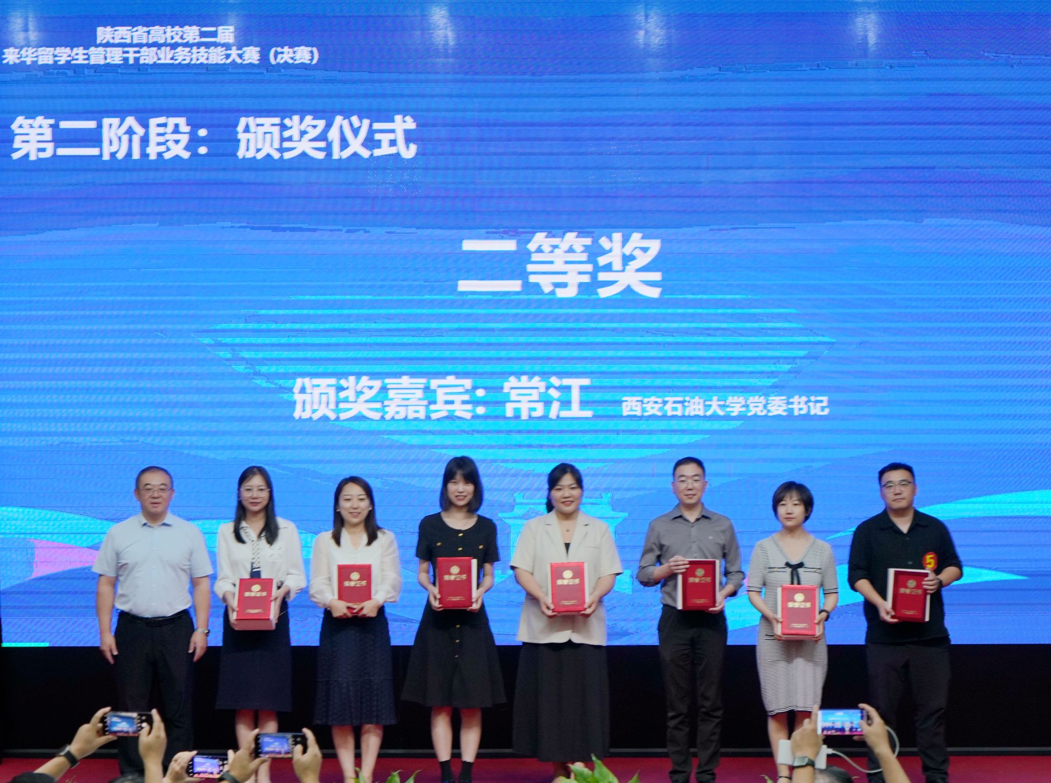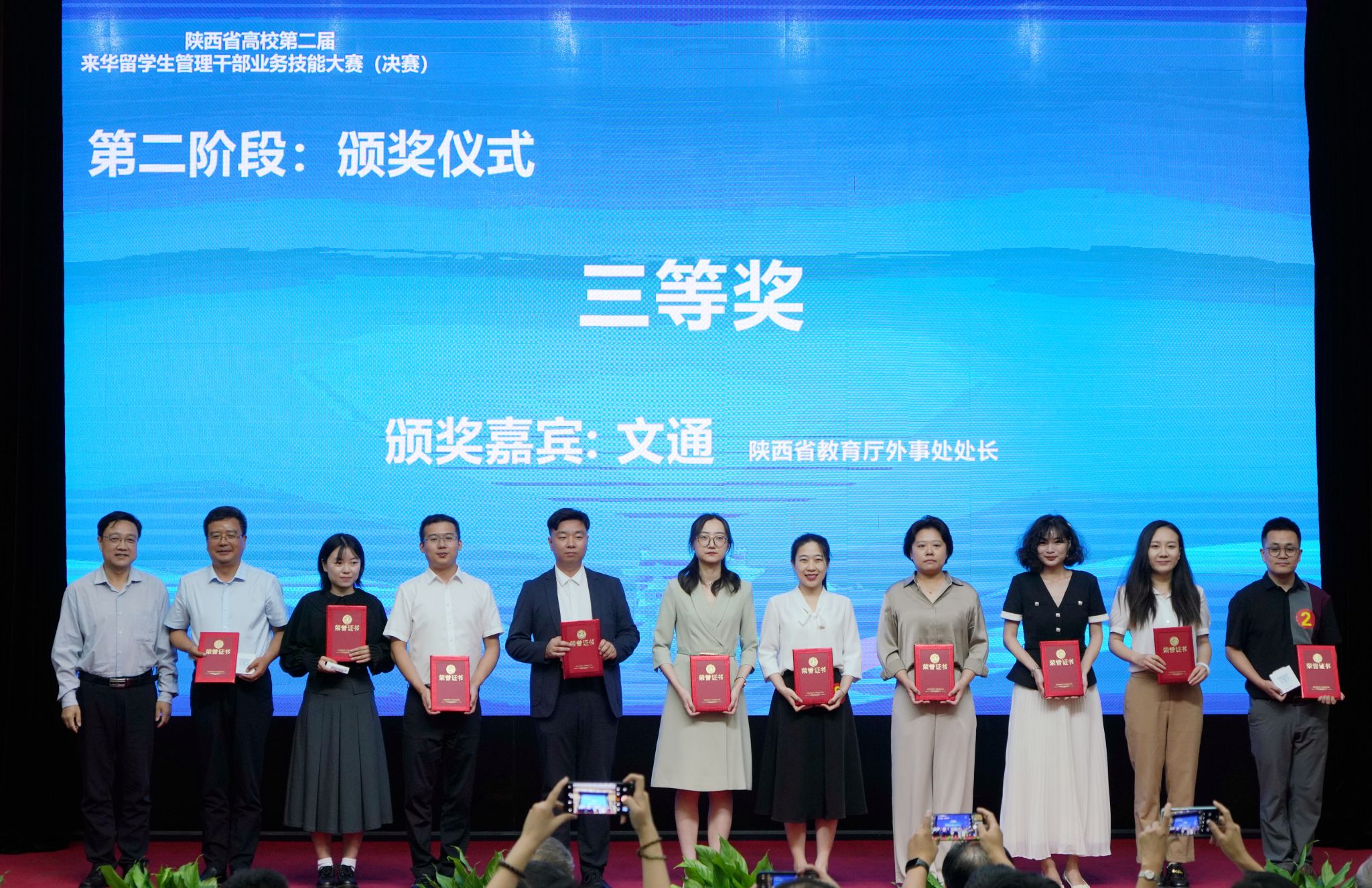 2024年9月13日下午,由陕西省教育厅、陕西省高等教育学会主办,陕西省高等教育学会外国留学生教育管理分会、bat365中文官方网站承办的陕西省高校第二届来华留学生管理干部业务技能大赛(决赛)在bat365雁塔校区成功举办。中共陕西省委教育工委副书记王海波,bat365中文官方网站党委书记常江,陕西省高等教育学会副会长、bat365原党委书记惠泱河,省教育厅对外合作与交流处处长文通等出席大赛颁奖仪式,并分别为一、二、三等奖获得者颁发获奖证书和纪念品,副校长张荣军主持颁奖仪式。