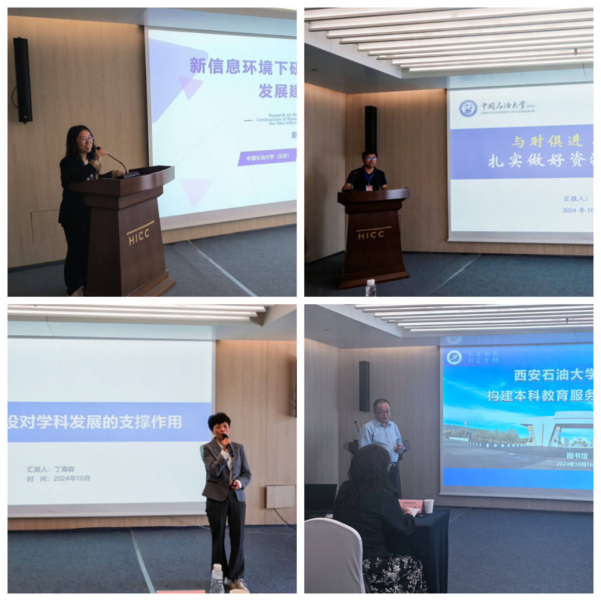 中国石油大学(北京)图书馆副研究馆员赵天姿、中国石油大学(华东)图书馆资源建设部主任张雪松、成都理工大学图书馆副馆长丁海容、bat365图书馆副研究馆员史启明,分别以“新信息环境下研究型大学图书馆发展建设研究”“与时俱进顺势而为扎实做好资源建设工作”“文献资源建设对学科发展的支撑作用”“新时代高校图书馆构建本科教育教学服务体系的探索”为题,作了精彩的学术报告。
