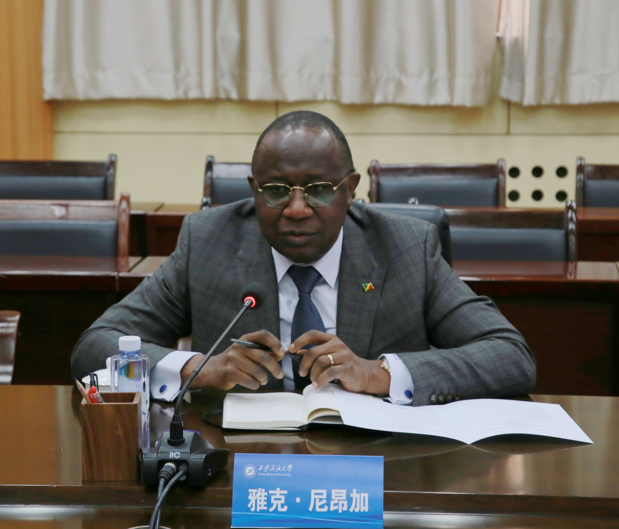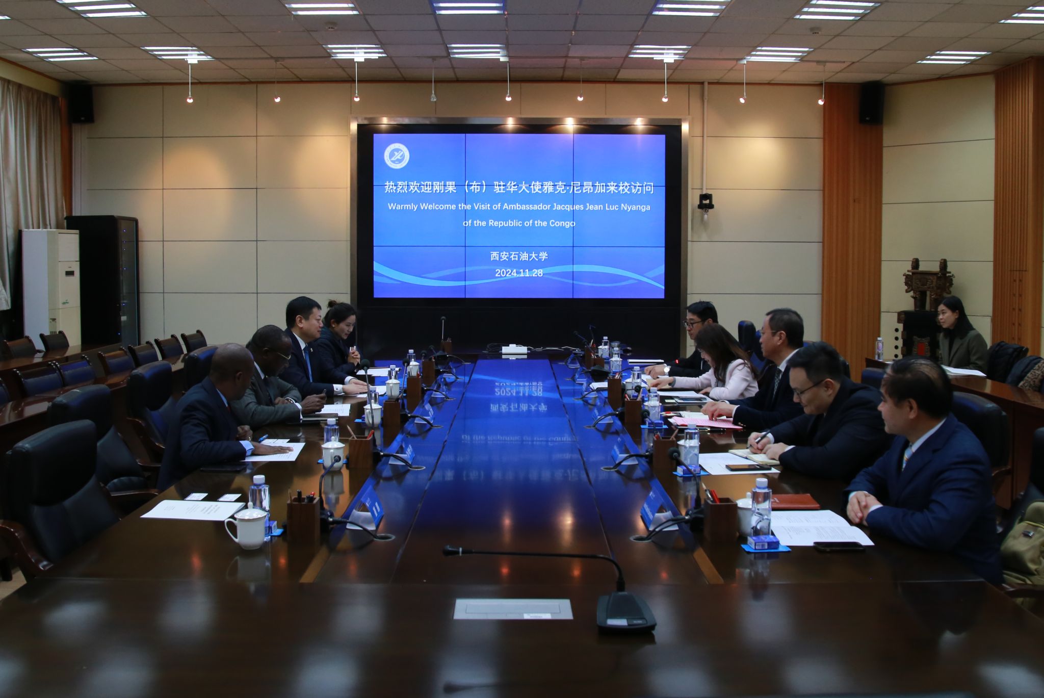 11月28日上午,刚果(布)共和国驻华大使雅克·尼昂加(Jacques Nyanga)、刚果(布)驻华教育参赞艾梅·埃托卡·贝卡(AiméEtoka-beka)及油升联国际有限公司总裁邵森、总经理助理宋白鹤等一行来校访问。校长王进富会见代表团一行,副校长张荣军出席政校企三方合作座谈会,座谈会在雁塔校区会议中心第二会议室召开。