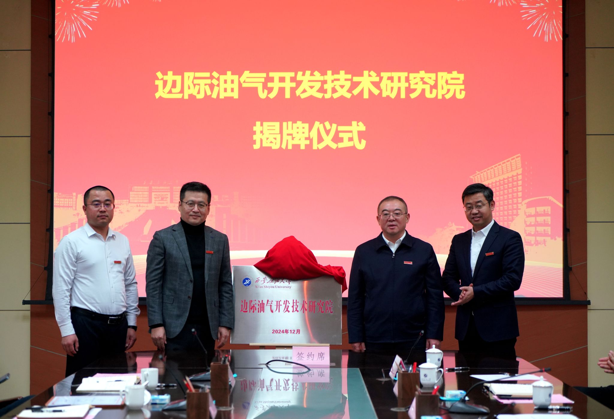 学校党委书记常江、校长王进富、石油工程学院院长黄海、边际油气开发技术研究院崔仕章共同为边际油气开发技术研究院揭牌。