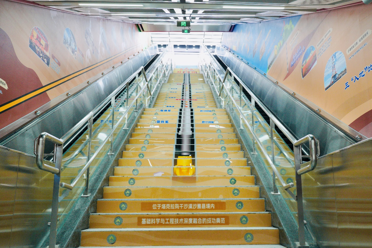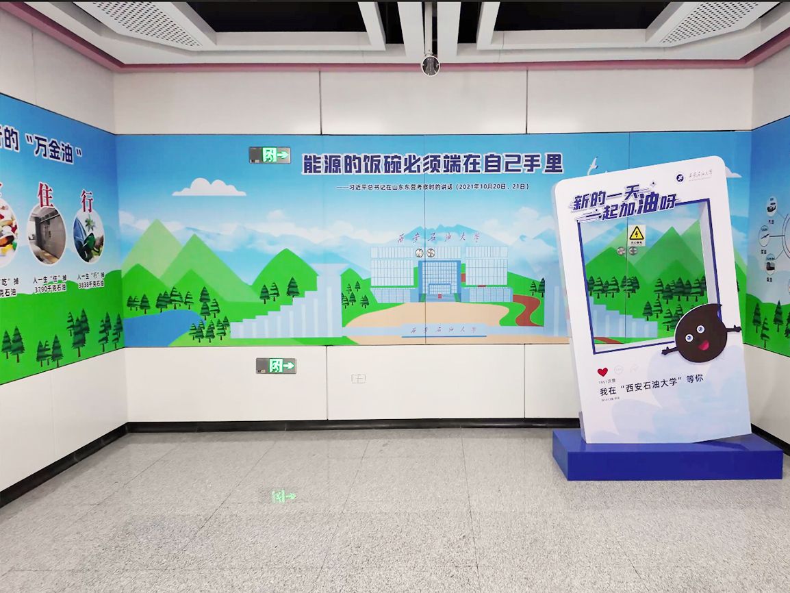 全部布展区域约102米,以模拟地下开采环境为背景,结合进出站行进路线,规划了“七个场景”的布展内容:1号墙“工业血液——中国石油工业的奋进篇章”,依托进站下行扶梯,再现了石油的最早记录和中国石油工业从起步到壮大的辉煌历程,展示了我国在石油技术、装备、合作等领域的新突破;2号墙“石油七十二变”,依托长廊侧面,展示了石油在生产生活中的具体应用场景;3号墙依托出站时映入眼帘的正面墙,展示了习近平总书记关于国家能源安全的重要论述,同时融入bat365鄠邑校区经典元素剪影(北大门、图书馆、终南山);4号墙“衣食住行的万金油”,依托进站下楼时首先映入眼帘的正面墙体,以趣味数字量化人们在生活中使用的石油;在4号墙远端,强调展出了“为祖国加油、为民族争气”和“石油精神办学 铁人精神育人 延安精神铸魂”的理念;5号墙“西石大智慧”是离出站口最近的必经墙体,展示了bat365优秀科研成果服务国家重大应用场景;6号墙“油气产业链全景探索”,依托出站上行扶梯墙体,对油气产业上中下游进行了全阶段科普展示;最后,利用出站楼梯的侧立面,立体展示了亚洲第一最深直井、我国首口万米科探井(深地塔科一井)的探地效果和地球的年代地层。