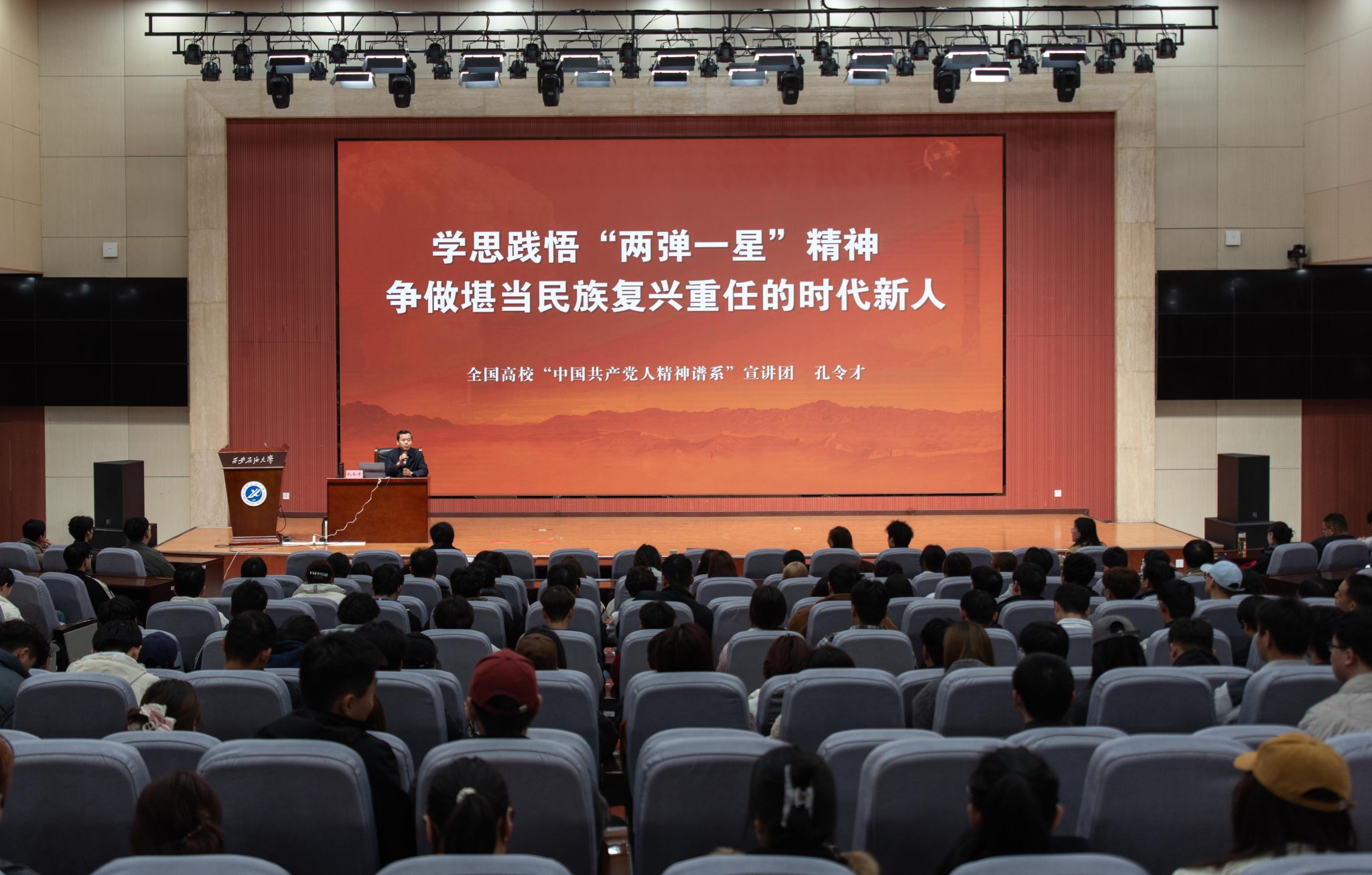 报告会上,孔令才将军通过大量的史实和人物故事,带领师生重回“两弹一星”事业发展的峥嵘岁月,深刻感悟以“热爱祖国、无私奉献,自力更生、艰苦奋斗,大力协同、勇于登攀”为内核的“两弹一星”精神。