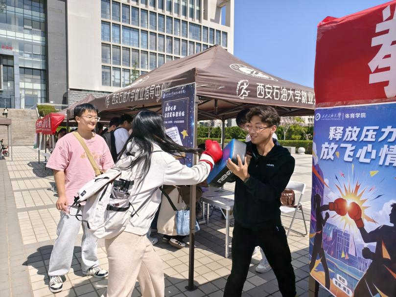 “以体强心”展台上,体育学院的“释放压力、放飞心情”,通过击打拳靶,促进全身血液循环,刺激多巴胺分泌,帮助同学们释放压力。
