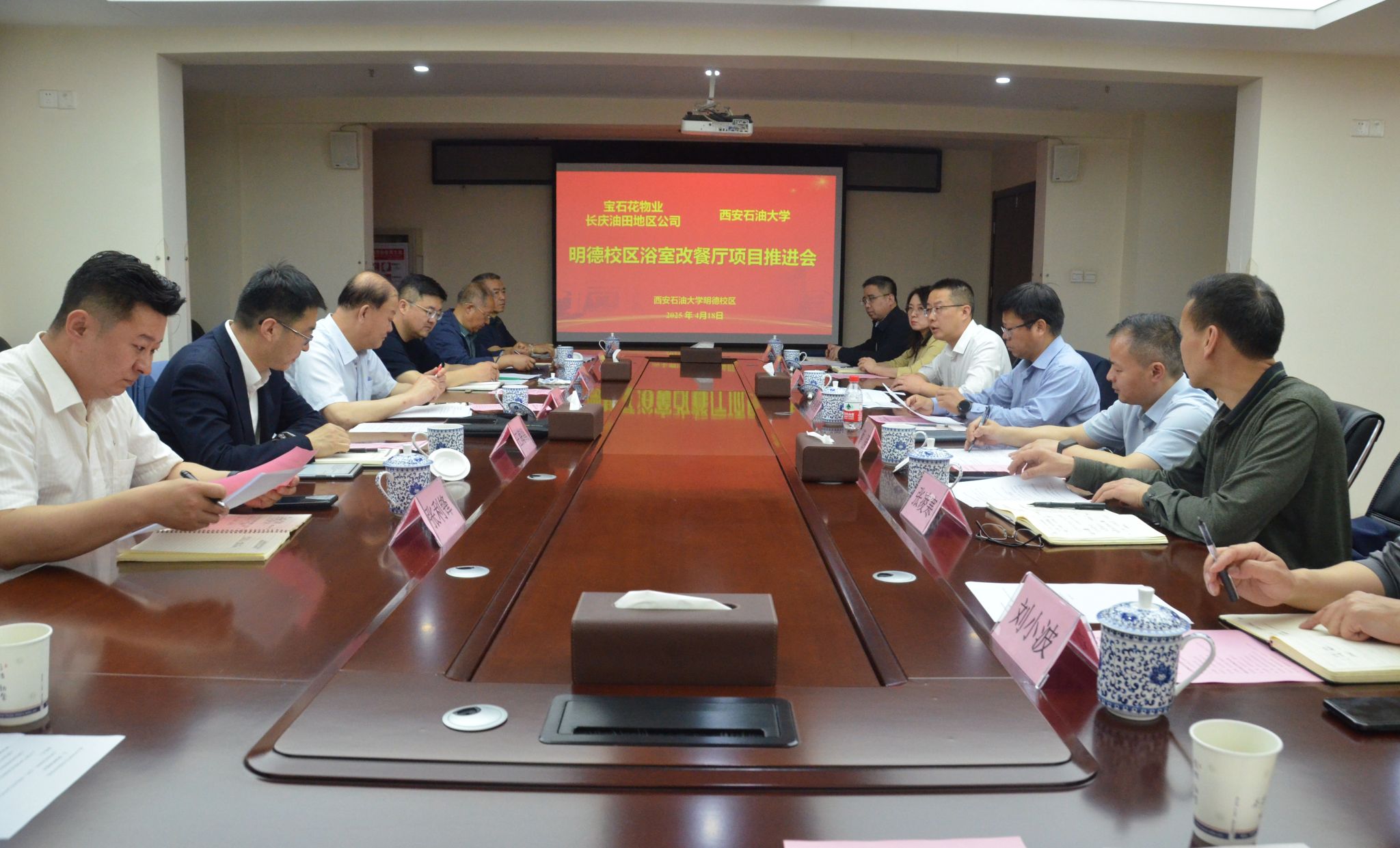 4月18日上午,学校与宝石花物业长庆油田地区公司召开“明德校区餐厅改造提升项目”推进会,双方围绕项目设计方案进行了深入洽谈。宝石花物业管理有限公司副总裁、长庆油田公司总经理陈军,学校副校长张骁勇出席会议。宝石花物业长庆油田地区公司相关部门负责人、陕西建大建筑设计研究所有限公司设计师等6人,bat365发展规划处、研究生工作部、后勤处、国际教育学院及继续教育学院负责人参加会议。