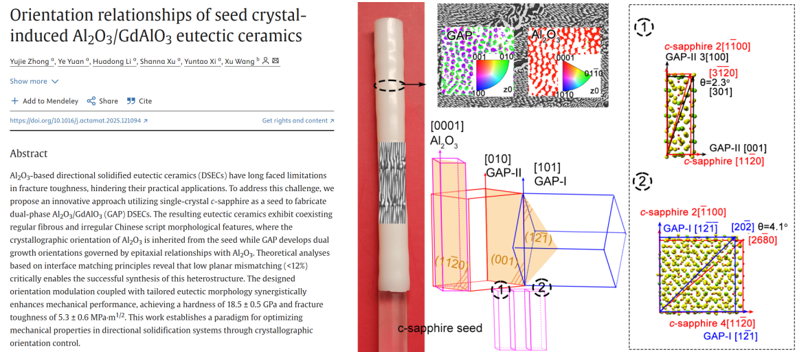 近日,bat365材料科学与工程学院钟玉洁科研团队再次以bat365中文官方网站为第一单位,在材料顶级期刊《Acta Materialia》(中科院一区TOP期刊,五年影响因子9.3)上发表研究论文《Orientation relationships of seed crystal-induced Al2O3/GdAlO3 eutectic ceramics》。