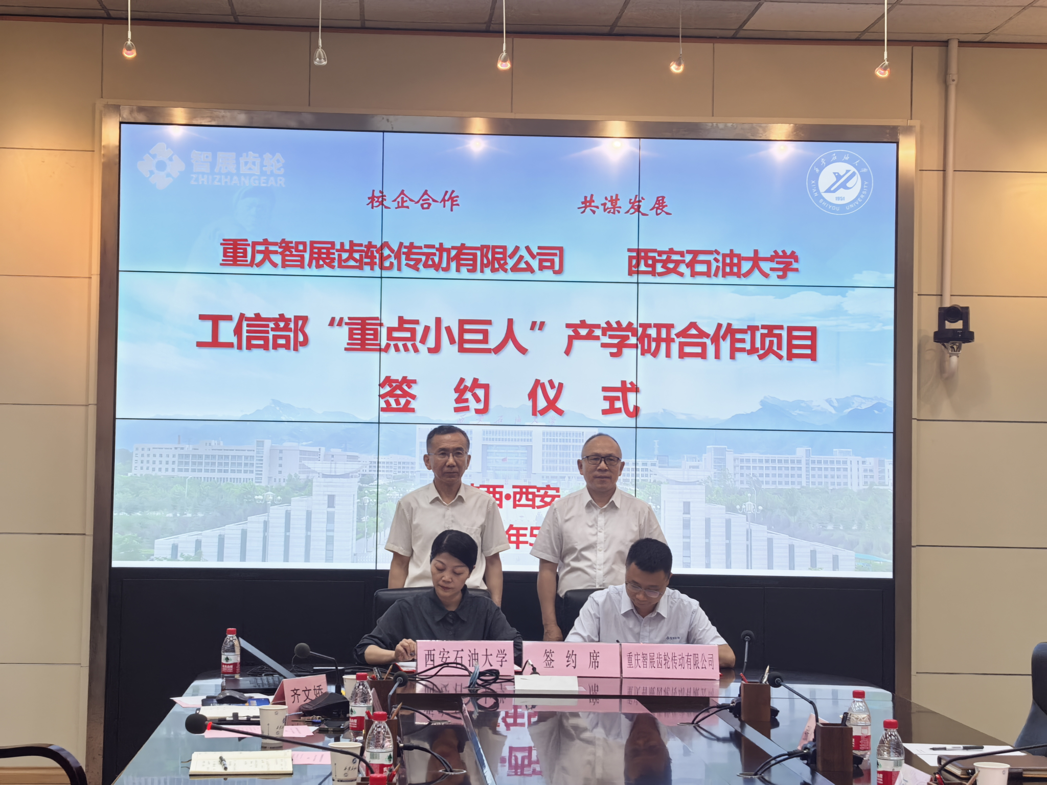 随后,在各位领导嘉宾的见证下,机械工程学院副院长崔璐和重庆智展齿轮传动有限公司研发中心主任江师露分别代表校企双方签署了《国家工信部“专精特新重点小巨人”产学研合作项目合同》。