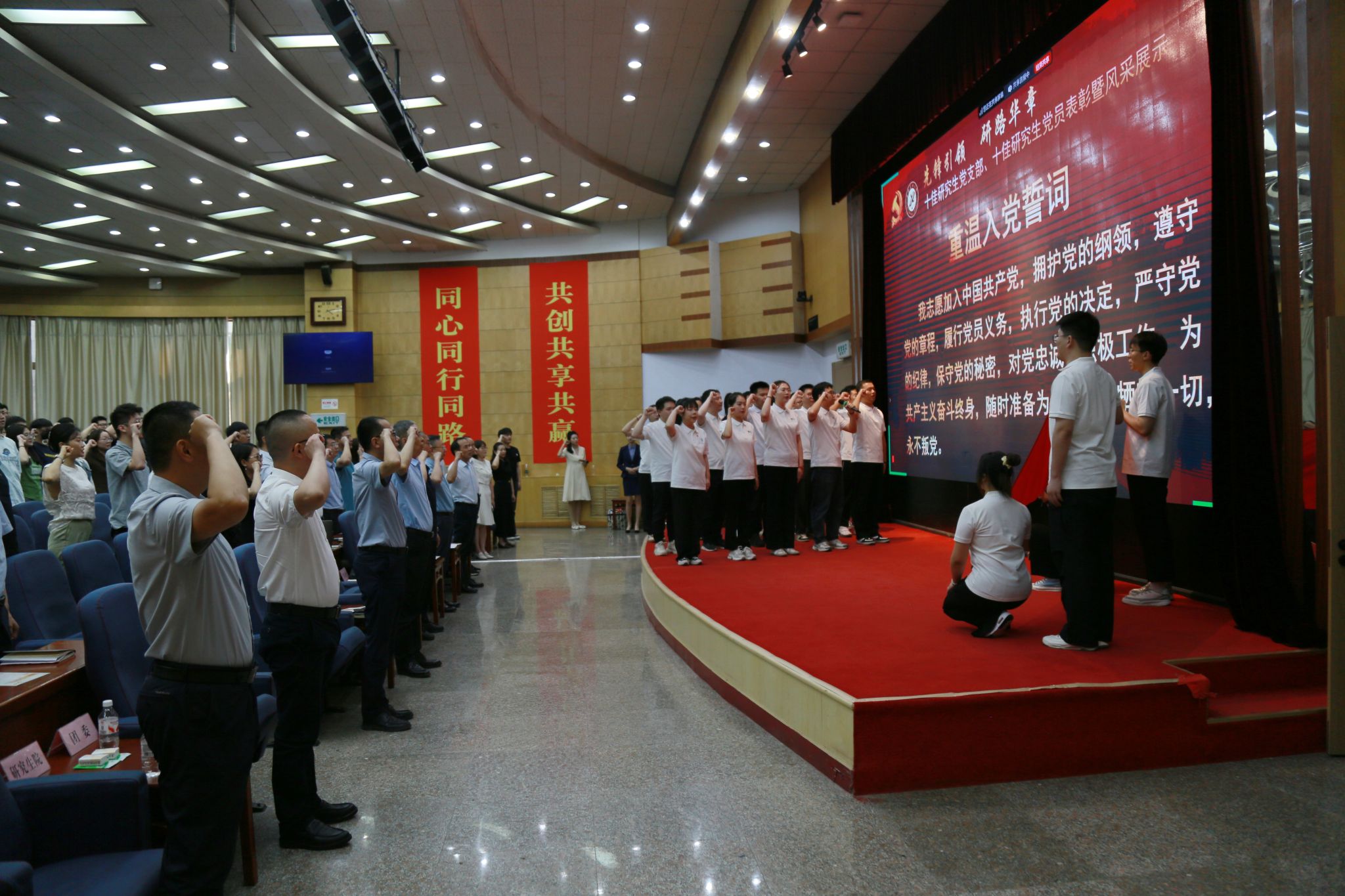 展示结束后,现场全体党员在“双十佳”研究生党员的带领下重温入党誓词。大家举起右拳,庄严宣誓,再一次用入党誓词洗涤心灵,激发为共产主义奋斗终生的昂扬精神。