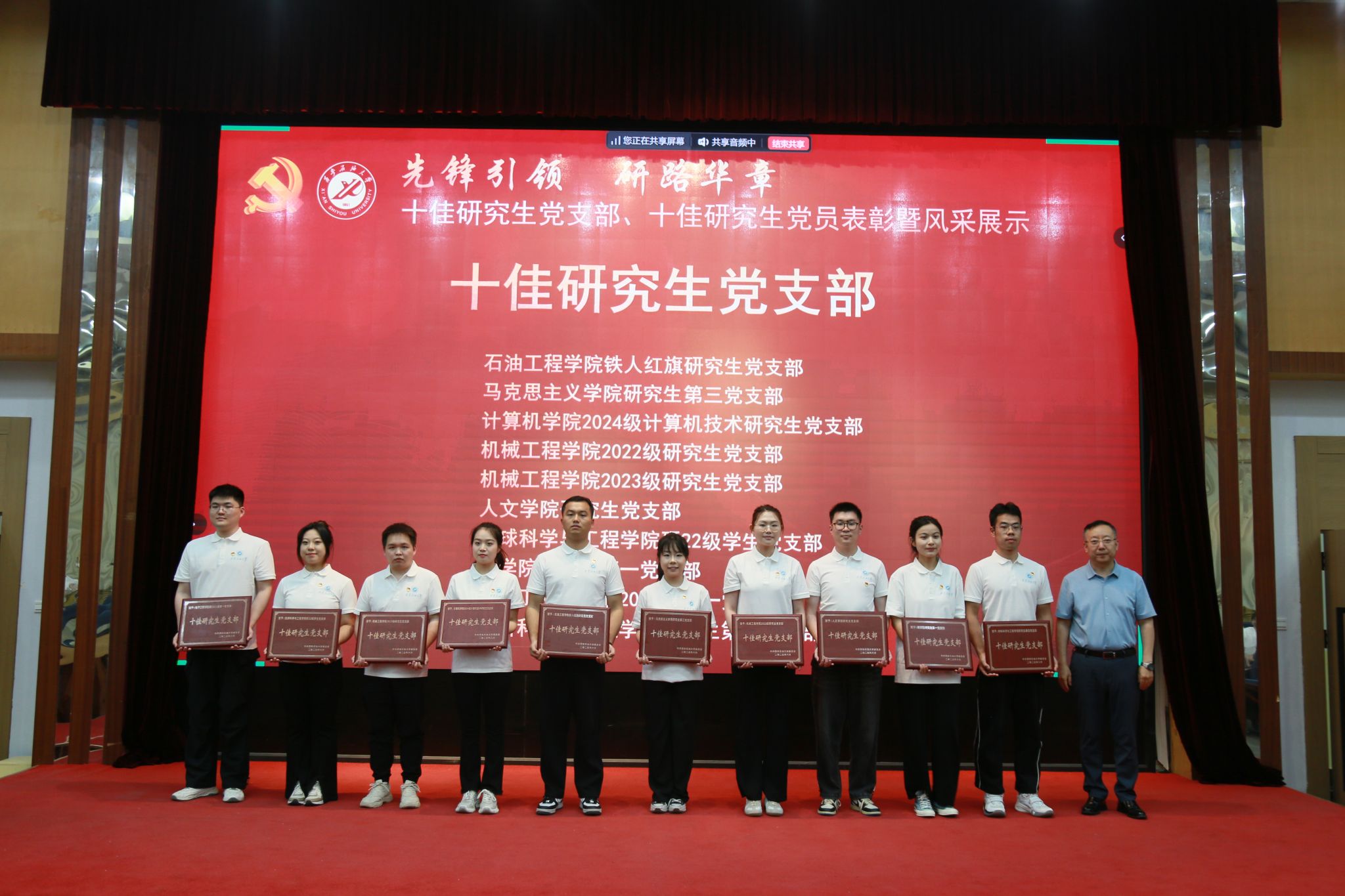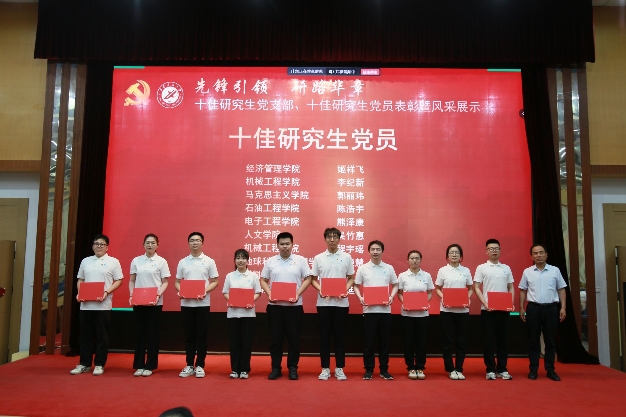 研究生工作部部长田虹霞宣读学校表彰决定。种宇宏、宣传部部长赵承胜分别为荣获“十佳研究生党支部”和“十佳研究生党员”荣誉的先进集体与优秀个人颁发奖牌和荣誉证书。