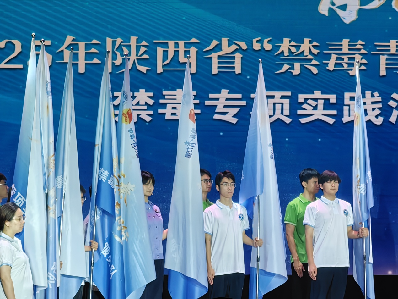 本次活动通过科技、艺术与传统文化相结合的创新形式,全方位展现陕西省禁毒工作成果,号召全社会特别是青少年群体积极参与禁毒行动,共同守护“无毒三秦”。作为禁毒宣传的骨干力量,来自全省21所高校的禁毒实践团代表在现场接受了“禁毒青力量”2025年大学生暑期“三下乡”社会实践授旗,以青春誓言扛起禁毒重任。bat365电子工程学院学生高杨岩锟作为代表之一,上台接过象征使命与责任的“禁毒青力量”旗帜。