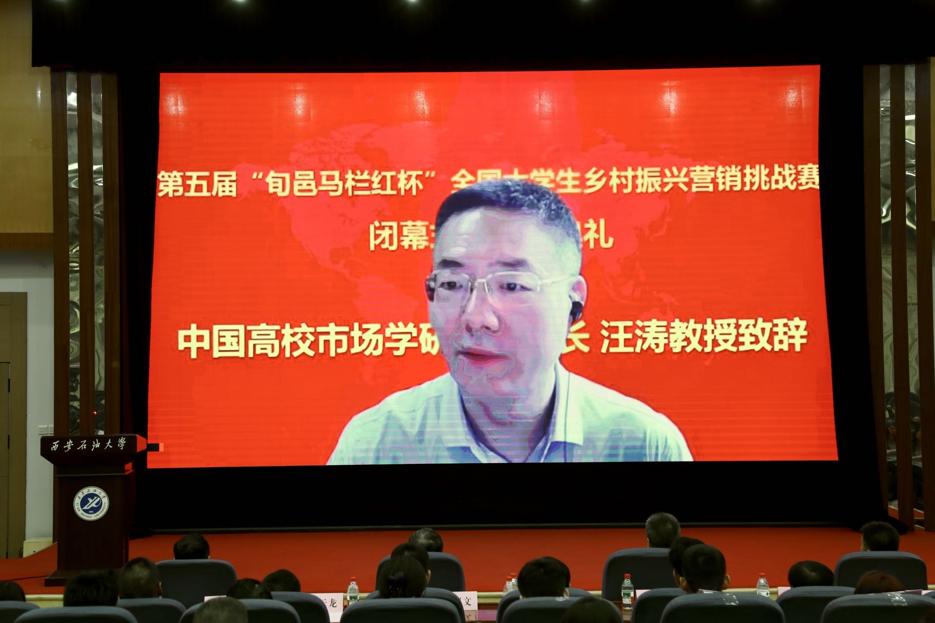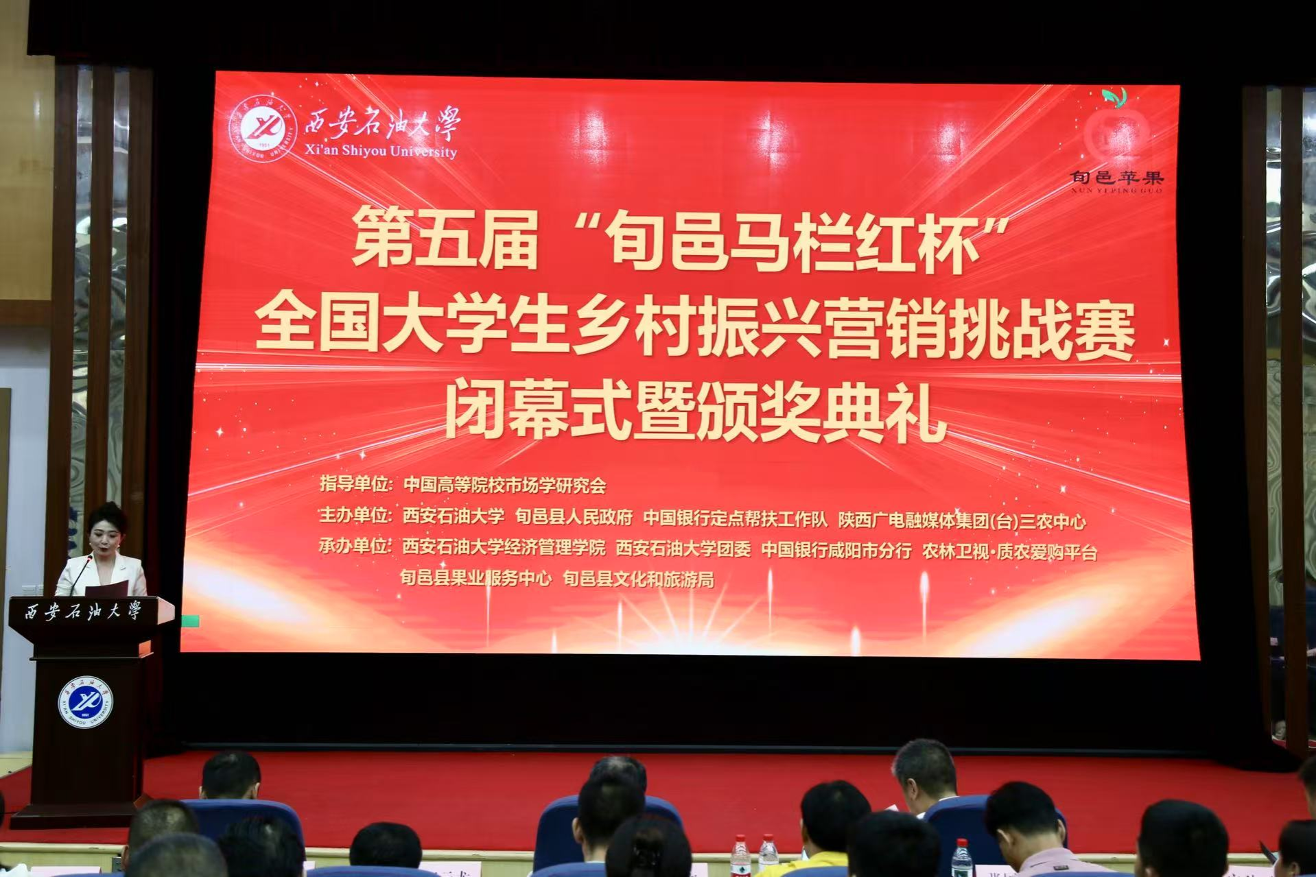 7月3日,第五届“旬邑马栏红杯”全国大学生乡村振兴营销挑战赛闭幕式暨颁奖典礼在bat365中文官方网站雁塔校区会议中心顺利举行。本届赛事由bat365中文官方网站、旬邑县人民政府、陕西广电融媒体集团三农中心等单位共同主办,中国高等院校市场学研究会为指导单位。咸阳市副市长叶新阶、副秘书长何有明、农业农村局副局长袁野,陕西省果业中心综合处处长张东峰,旬邑县委副书记、县长陈永胜、副县长谭震,陕西广电融媒体集团质农爱购平台总经理赵小飞,中国银行咸阳分行行政事业部主任朱燕萍、陕西日报群众新闻网副总经理刘强,bat365中文官方网站党委副书记张木等出席闭幕式。参赛团队、企业负责人百余人到场参会。
