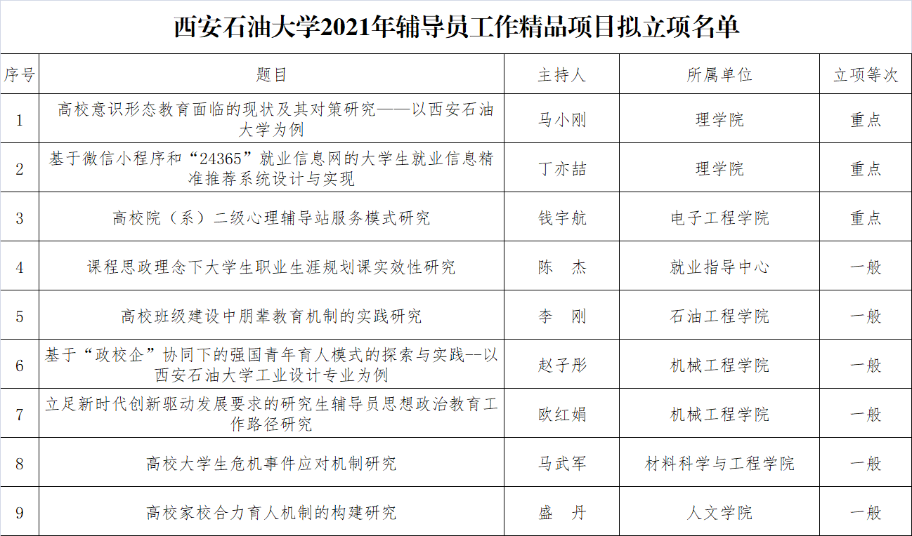 根据《关于开展2021年辅导员工作精品项目和研究课题申报的通知》(学工函〔2021〕52号)的工作安排,经个人申报、所在单位推荐和专家评审,拟对2021年辅导员工作精品项目9项、辅导员工作研究课题15项立项建设。现将拟立项名单予以公示。