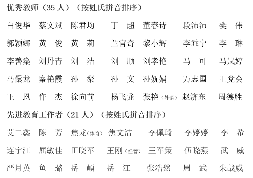 根据《bat365中文官方网站优秀教师 先进教育工作者评选表彰办法》(西石大党[2021]47号)和《关于2024年度优秀教师、先进教育工作者推荐评选的通知》,经学校优秀教师、先进教育工作者评选表彰工作领导小组评选,现将2024年优秀教师、先进教育工作者公示如下: