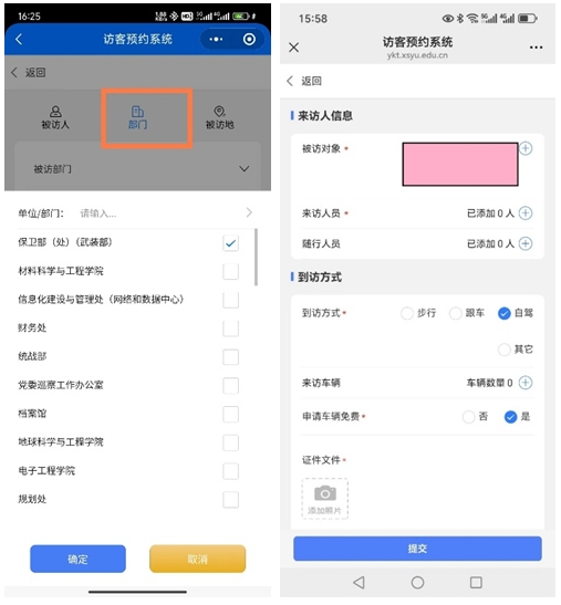 ⑤点击被访对象加号,选择“部门”,点选被访部门后确定,添加来访人员姓名、数量、车牌号码、出入时间等信息,选择到访方式以及是否申请免费等,上传大型活动、交流会议学校批示件后提交。