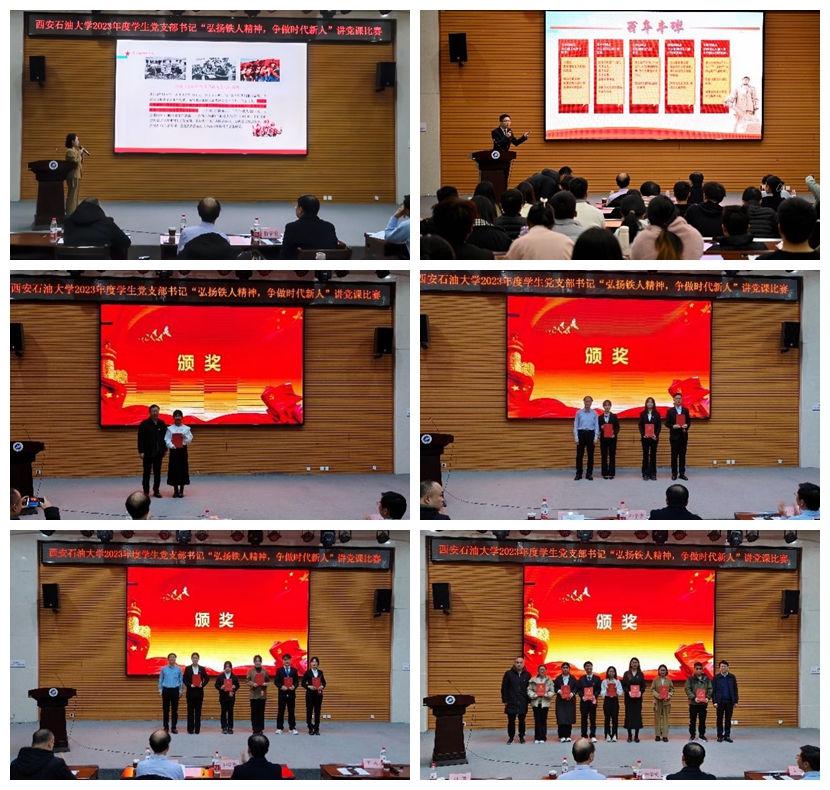 为全面提高学生党员教育培养质量,激发大学生党员责任意识和担当意识,12月9日下午,学校2023年度学生党支部书记“弘扬铁人精神,争做时代新人”讲党课比赛决赛在鄠邑校区就业指导中心多功能厅举行。学校部分党群部门负责人担任比赛评委,各院(系)学生工作办公室主任、组织员和全校近300名党员代表观摩了比赛。