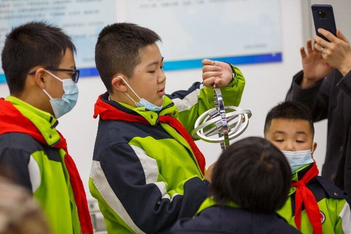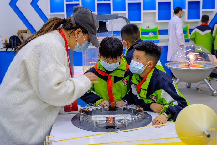 在理学院物理演示中心,理学院教师和学生志愿者对演示实验项目的原理、操作方法和注意事项进行了详细的讲解和演示,引导代表团的中小学生认真观察实验现象、提出问题、主动探索,并指导大家亲身体验各个实验项目。其中特斯拉放电、茹科夫斯基转椅、锥体上滚、电磁炮、GPS全球定位系统演示仪、彩色影子等项目给学生们留下了深刻的印象。