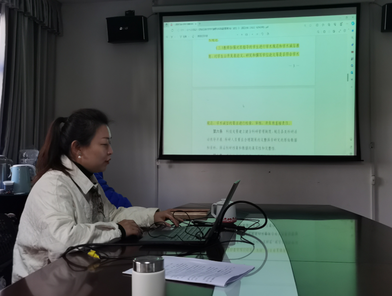 系副主任张帆领学了《bat365中文官方网站学术道德与科研诚信管理办法(试行)》(西石大科[2022]182号)等十余个关于学术道德和科研诚信的相关文件,对文件内容进行了解读。她要求全体教职工一定要遵守学术规范、坚守学术诚信,加强学术道德自律,营造良好的学术道德氛围。