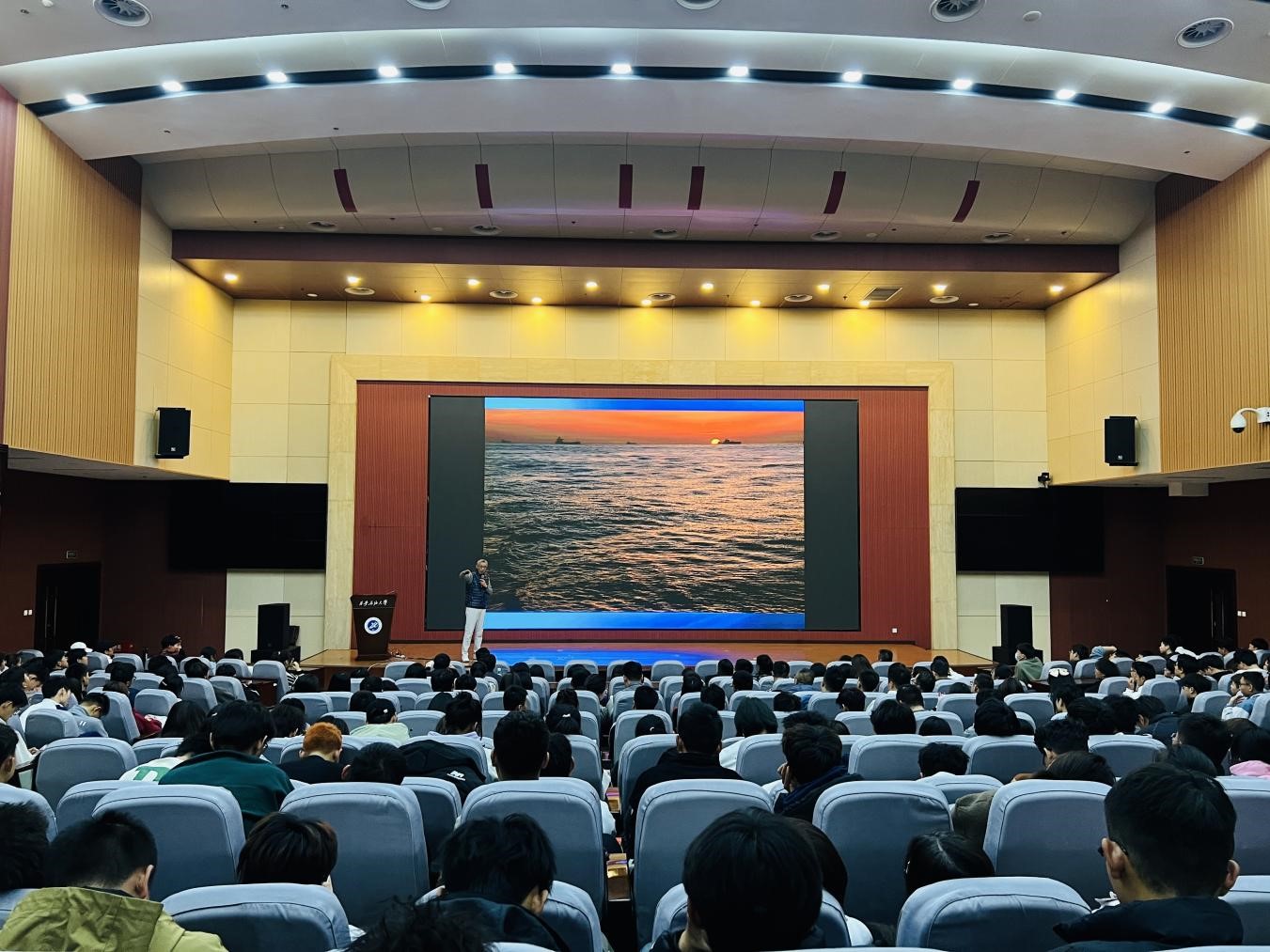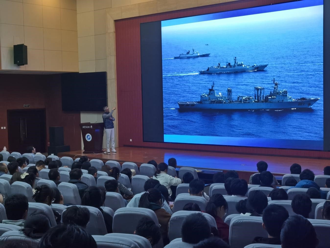 陈俨将军结合曾在西沙群岛、亚丁湾护航编队等地工作的经历,以第五批护航编队工作为例,从编队的基本情况,护航任务的执行过程,亚丁湾海盗活动的部分特点,护航官兵执勤、工作和生活状况,亚丁湾护航行动的意义与启示等五个方面对我国海军护航工作做了全面的介绍。作为中国摄影家协会和中国新闻摄影协会会员,陈将军通过百余幅自己拍摄的摄影作品,生动有趣的向在座师生还原了多彩的军旅生活、展示了新时代海军良好的精神风貌,使其感受到了作为一名中国人民海军、一名护航队员的无上荣光。报告的最后,陈将军激情满怀的朗诵了其创作于亚丁湾护航任务期间的诗歌《远方》作为结束语:“亲爱的战友们,我们从远方回来了。9.2万海里蓝色航迹,192个晨晖暮影,825颗心灵相拥……当国歌的第一声音符撞击心灵的时候,我们在心底默默而坚定的对远方说:亚丁湾,我们来了!”