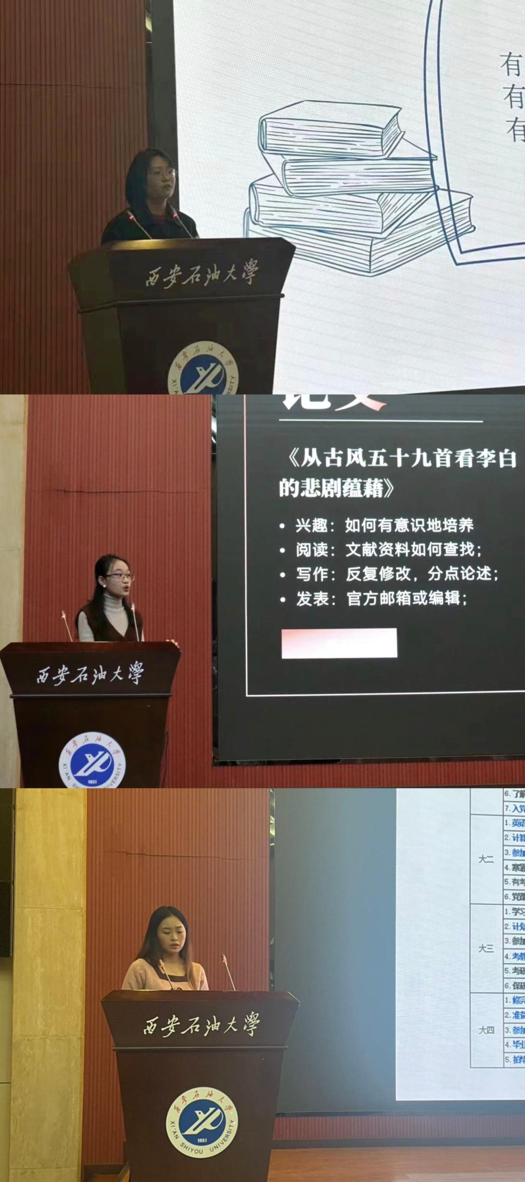杜志革以求学经历为始展开演讲,分享自身从大一到大四的不同感悟与心路历程。她谈到,大一的迷茫不可怕,但要坚定一个认知:人各有志,一个人是很舒服的状态。随后,她重点分享了关于英语学习的干货与技巧,并介绍了新闻专业有关专业学习的软件、网站等。夏妍月从研究生推免流程引入,就夏令营报名、预推免以及面试三个部分进行了详细解答。此外,她还分享了国家奖学金获奖的经验,并谈到了论文、专利的撰写发表以及专业实习实践的感悟。另外,她特别提到责任感,鼓励更多同学参与到志愿服务中,增强自身责任意识。雷茜的演讲从专业学习和科研竞赛开展,提及了大学生活中参与的各类竞赛,并鼓励同学们多多参与到社会实践中去。此外,她还展示了其大学四年的规划,给同学们提供了借鉴。