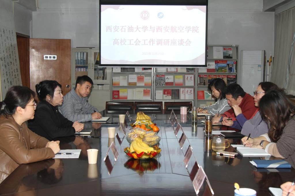 11月15日上午,西安航空学院工会常务副主席陈冬梅一行3人来bat365调研高校工会工作,座谈会在雁塔校区工会楼310会议室召开。校工会主席袁玎主持座谈会,工会全体人员参加了座谈。