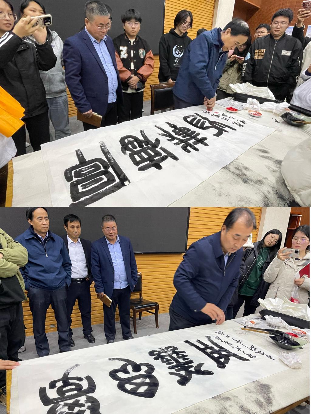 通过本次讲座,同学们对于汉字发展历史与书法欣赏有了进一步的了解。讲座结束之后,应我院盛情邀请,两位大篆文化研究大师在台上挥毫泼墨,窦德盛老师寄语人文学院“厚德载物”,刘博老师则以“学思善用”与同学们共勉。汉字是中华文化的灵魂和根基,也是传承中华文化的载体。坚持书法进校园,一定会让中华传统文化之树再度结出丰硕的果实。