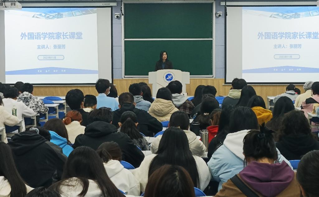 11月9日晚,外国语学院在鄠邑校区博览楼108教室举办家长课堂,我院学生家长张丽芳应邀担任主讲,2022级、2023级200余名本科生参加讲座。讲座由院党委副书记王业青主持。