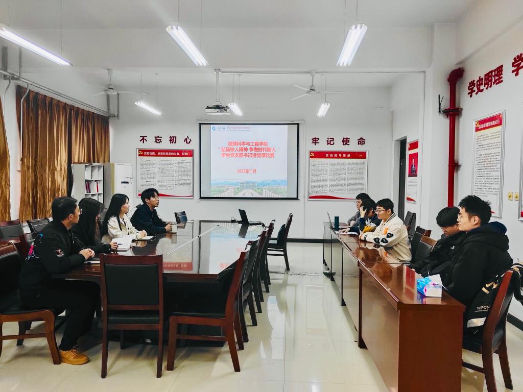 为深入开展学习贯彻习近平新时代中国特色社会主义思想主题教育,激发发广大党员责任意识,担当意识,激励全体党员继承和弘扬铁人精神,进一步发扬红色传统,赓续红色血脉,锤炼过硬本领,勇担时代使命,11月9日下午,地球科学与工程学院党委在鄠邑校区开物楼507党员活动室开展学生支部书记讲党课比赛院内选拔活动,活动由学院兼职组织员姜英哲主持,各年级辅导员老师参与评审。