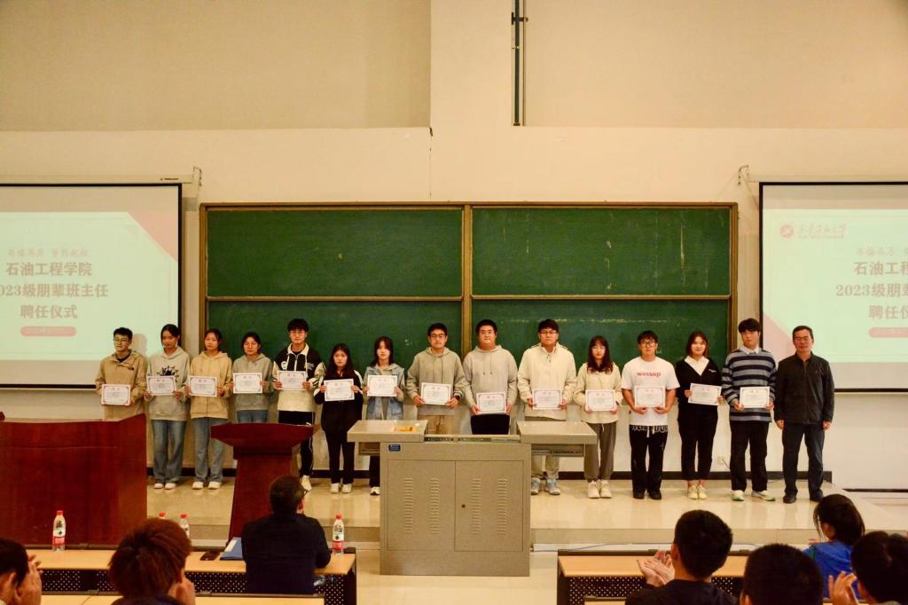 在聘任仪式上,张建高首先对受聘朋辈班主任表示祝贺,指出石油工程学院长期以来坚持以学生需求为导向,在助力大学生成长成才上积极探索,开展了“朋辈高数大讲堂”“英语四级朋辈导师制”“朋辈班主任”等系列朋辈教育活动,有力促进学院优良学风的形成,英语四六级、考研率逐年稳步提升,参与朋辈活动的学生骨干都得到了锻炼和提升。他在讲话中还强调,一是2023级朋辈班主任要继承发扬优良传统,在思想引领、学风建设、稳定安全、学科竞赛、校园文化传承与创新、志愿服务等方面发挥模范带头作用;二是2023级新生班团干部要充分发挥学生骨干作用,以身作则,团结同学,努力做到思想先进、学习优秀、工作积极、生活热情;三是各年级辅导员老师要充分遵循大学生成长规律,指导学生骨干规范工作,推动朋辈教育走深走实,进一步培育大学生的助人意识、服务意识和感恩意识,形成积极的人生观和价值观,营造健康、进取和感恩的朋辈互助型校园文化氛围。