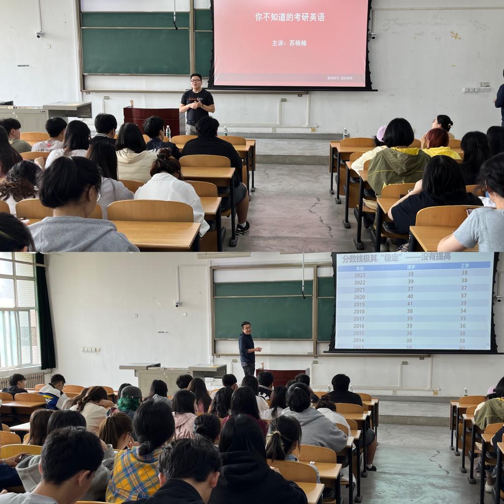报告会上,蔡乾锋老师结合自己的人生经历分析当前社会发展形势变化,就考研院校选择、备考具体事宜、考研注意事项三方面进行了详细讲解,引导同学们搜集信息、合理报考学校和专业,依据自身的学习情况确立适当的报考目标,帮助同学们规避考研常见风险,勉励同学们认真踏实复习、科学选择学校、积极应对考试,希望同学们能够全力以赴,认真备考。随后,苏楠楠老师从考研英语宏观形势、题型构成、备考重点和高效复习计划等方面,展开了系统全面的分析和讲解,一方面提高了学生对考研英语的认知,另一方面,为学生指明了考研英语备考的大方向。