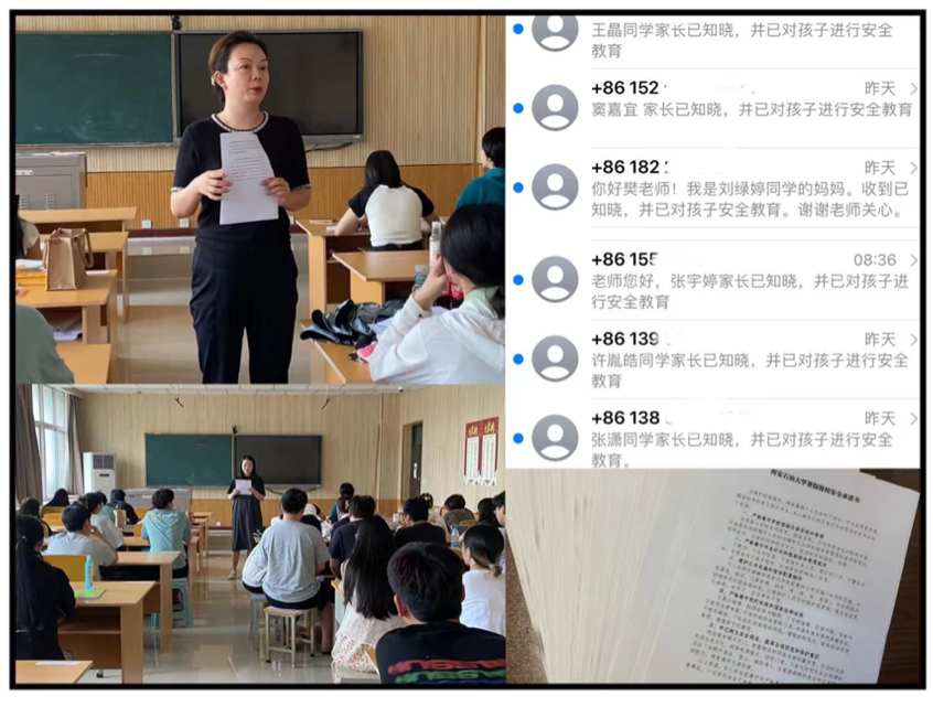 另外,学院组织学生签订《暑期留校安全承诺书》,建立留校学生微信群,并用短信及家长群通知的形式向所有留校学生家长确认学生留校信息,形成家校合力,共同做好学生的安全教育。