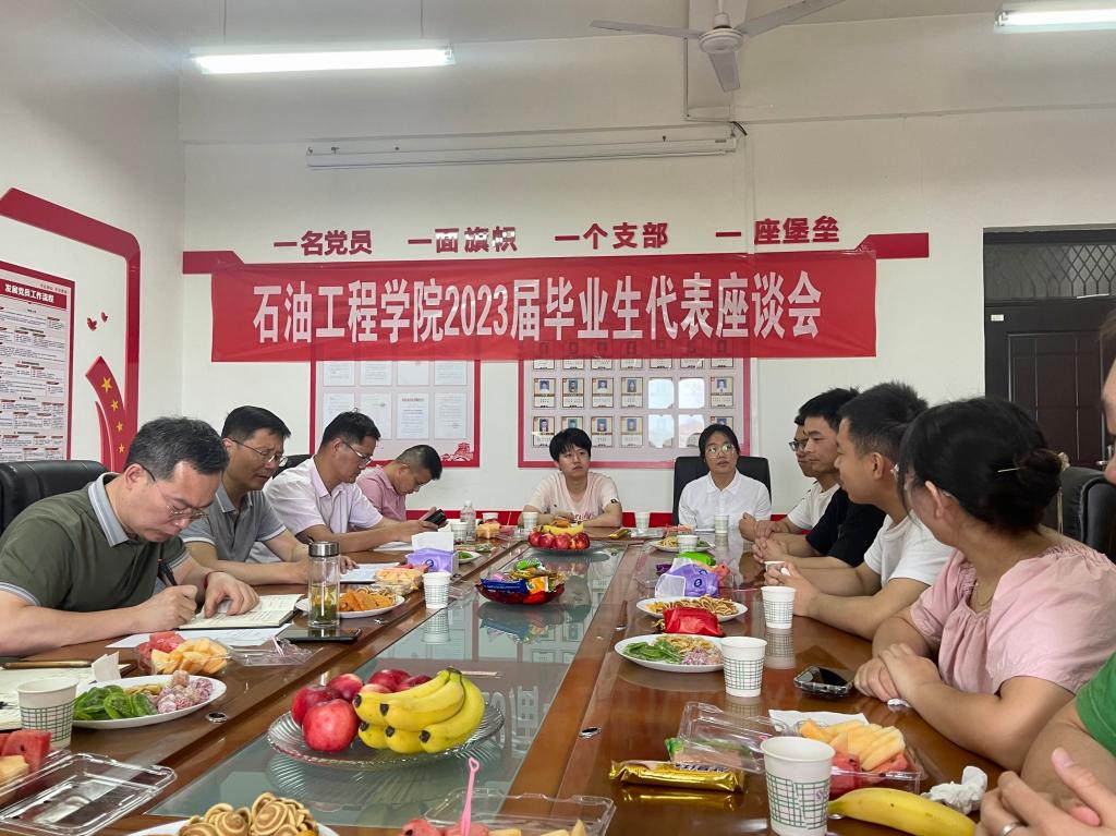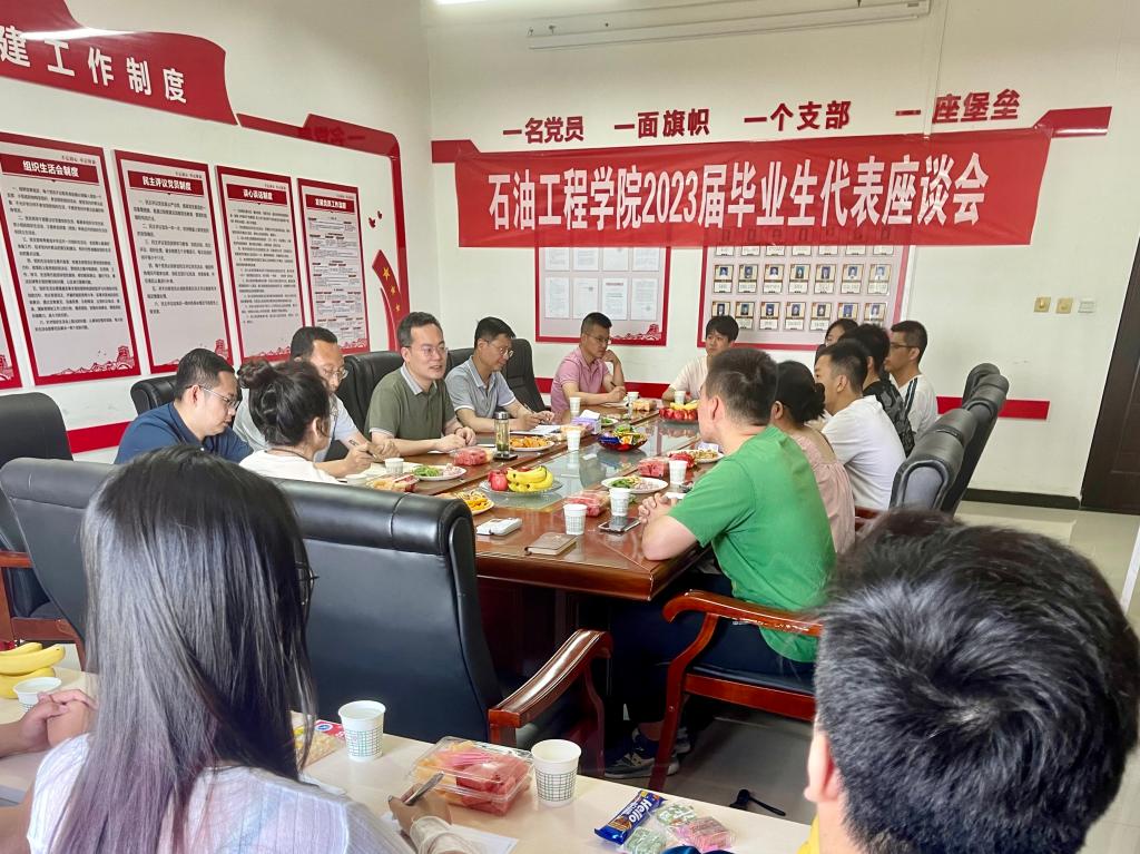 为进一步做好毕业生关怀服务工作,调研收集学生对于学校、学院人才培养、基础建设、服务保障等方面的建议,调动广大学生建言献策,助推学校高质量育人、高质量发展,引导2023届毕业生与学院同呼吸、共命运,积极为学院发展建言献策,6月14日上午,石油工程学院在鄠邑校区开物楼561召开2023届毕业生代表座谈会,学院党委书记马勇、党委副书记张建高、副院长赵金省、石油工程系主任蔡文斌、教学办公室主任刘晓阳、学生工作办公室主任黄景鹏、2019级辅导员王渊,2020级辅导员祖力皮亚及14名各专业毕业生代表参会,座谈会由张建高主持。