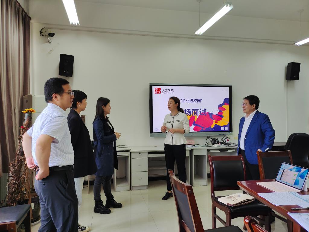 为进一步拓宽就业渠道,挖掘就业岗位,促进学生就业,5月30日,陕西西咸新区人才集团有限公司侯冬颖一行4人应邀来访交流并开展专场面试。人文学院党委书记余小勇、党委副书记盛丹、人文学院全体辅导员参加交流。