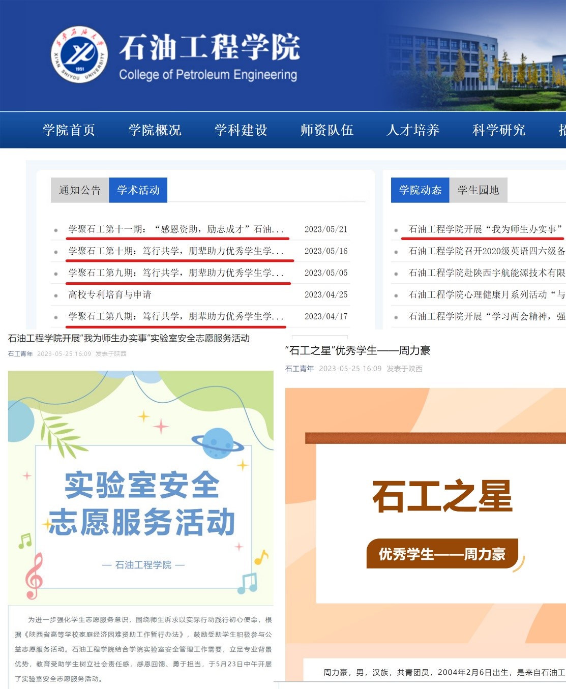 为加强资助育人活动的思政教育影响力,感召广大学生群体向榜样学习,我院努力打造一个资助育人活动综合宣传平台,以石油工程学院网站为基础,结合学校基层动态,石工青年、石工党员e家等新媒体公众号为辅助,广泛做好我院资助育人主题活动的宣传报导。自主题活动开展以来,宣传平台共推送新闻稿件十余篇,主要包括受助优秀学生先进事迹报导,优秀征文报导,志愿活动报导,获得千余次的点击量。